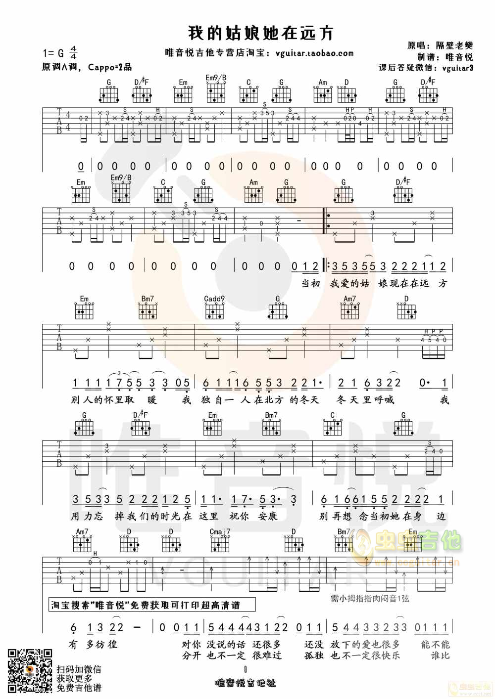 吉他隔壁老樊 我的姑娘她在远方 原版简单 唯音悦制谱