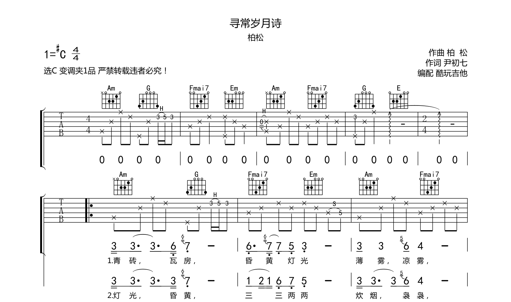 寻常岁月诗吉他谱-柏松-全网首发选C变调夹1品一定程度上还原了效果音频为手机录制只是录制了第一遍...