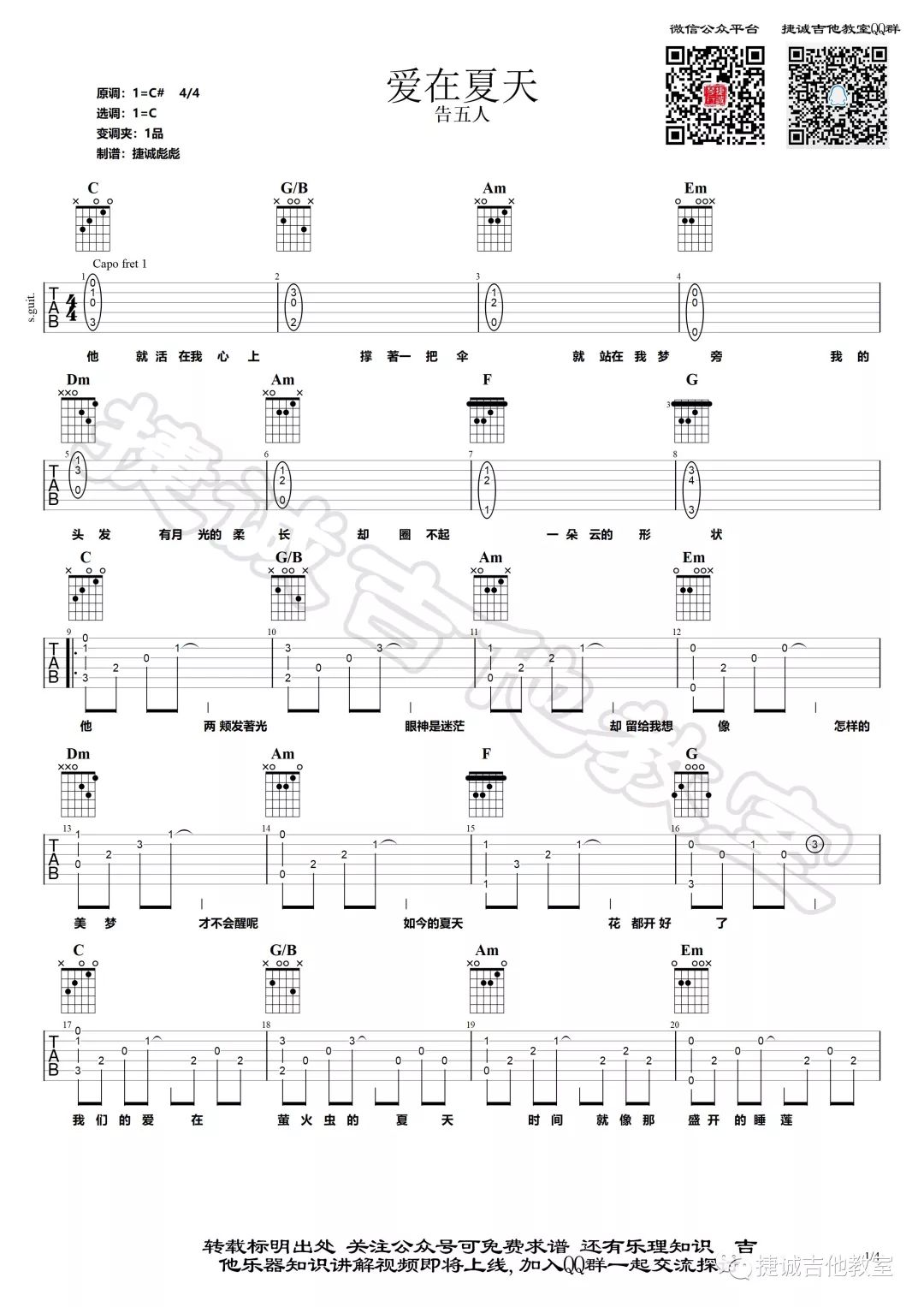 吉他告五人《爱在夏天》吉他谱 C调弹唱谱