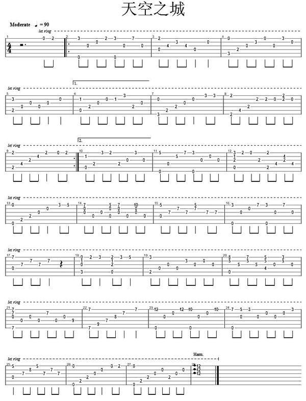 吉他动漫《天空之城》吉他谱 简单单音版
