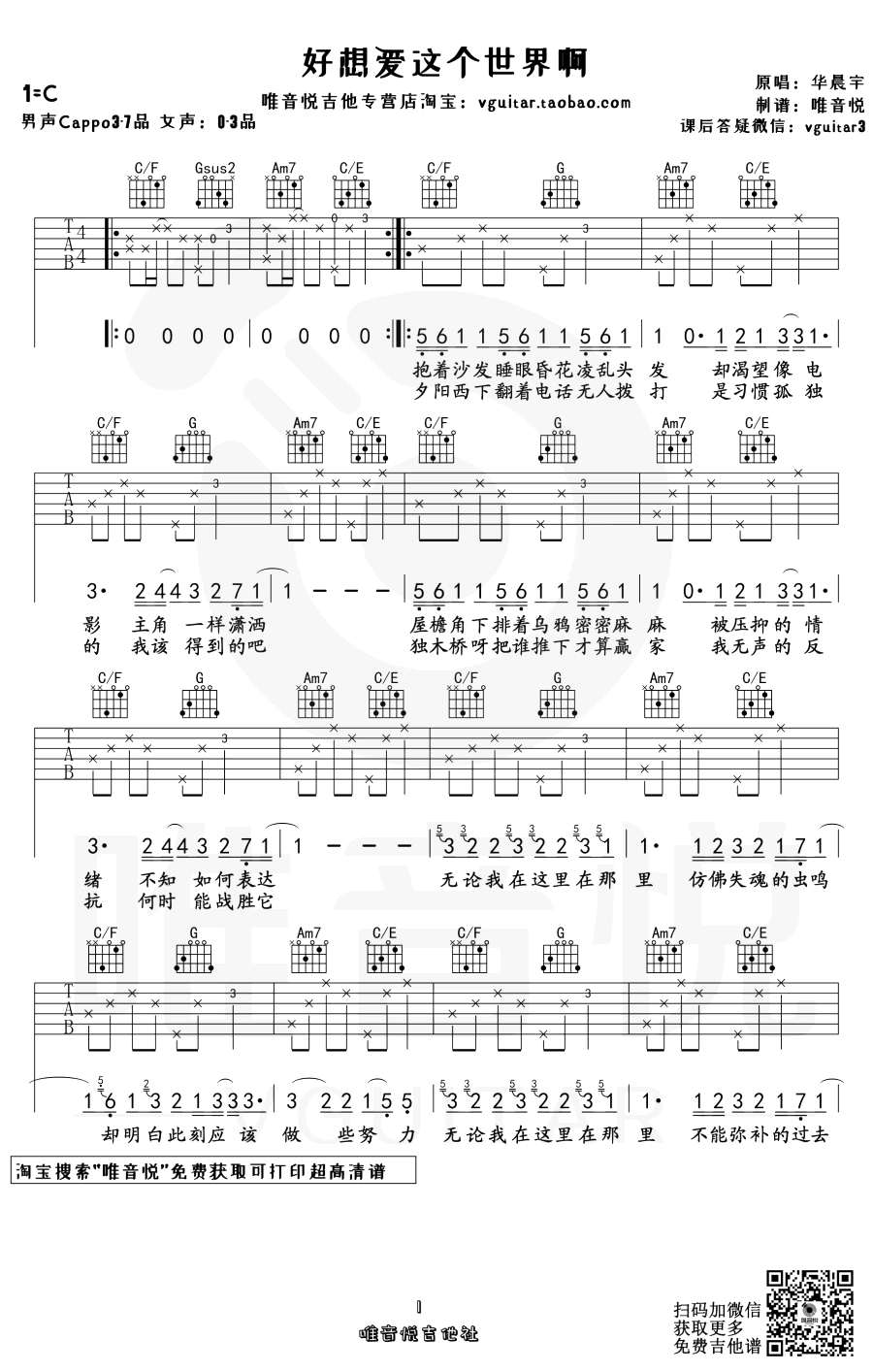 好想爱这个世界啊六线谱,C调指法,变调夹推荐男生3-7品女生0-3品。三张弹唱图片谱,唯音悦编配出品...
