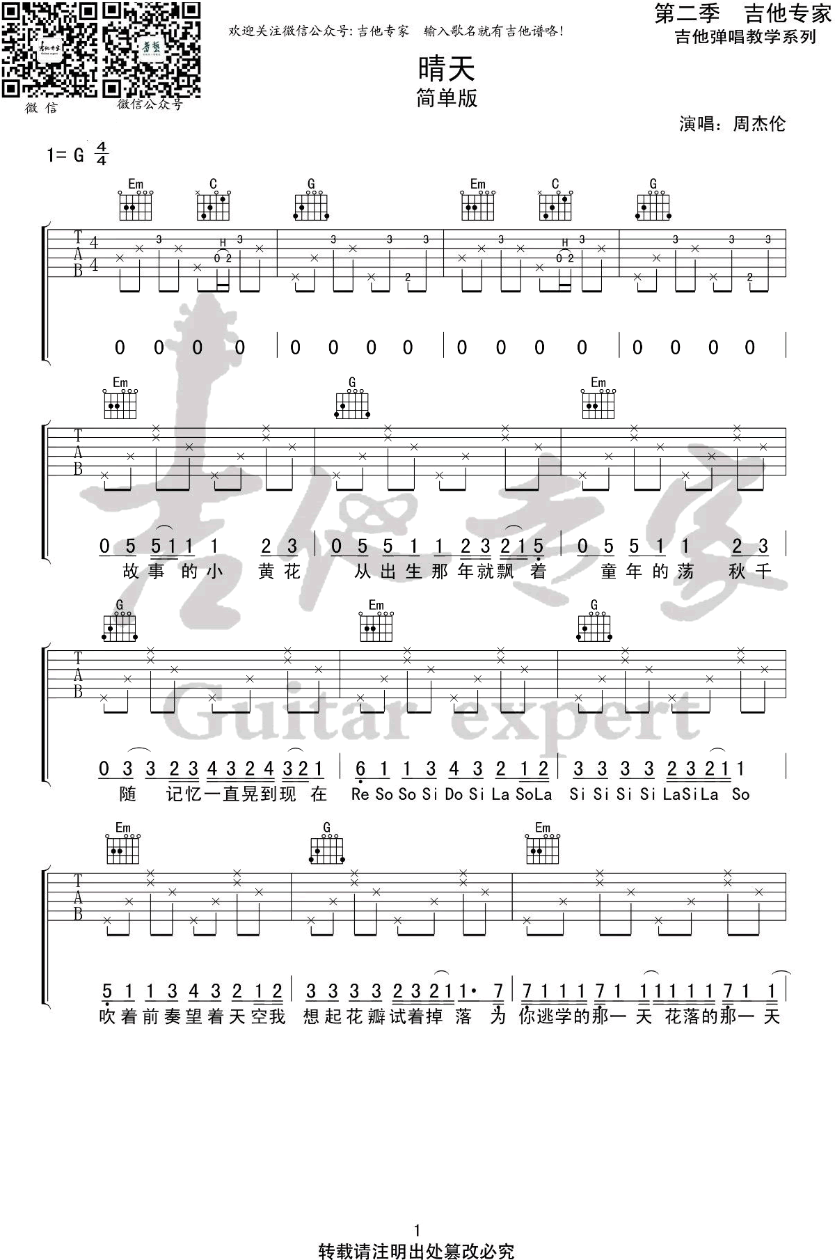 晴天吉他弹唱谱,G调指法简单版编配,三张高清图片六线谱。吉他专家制谱出品...