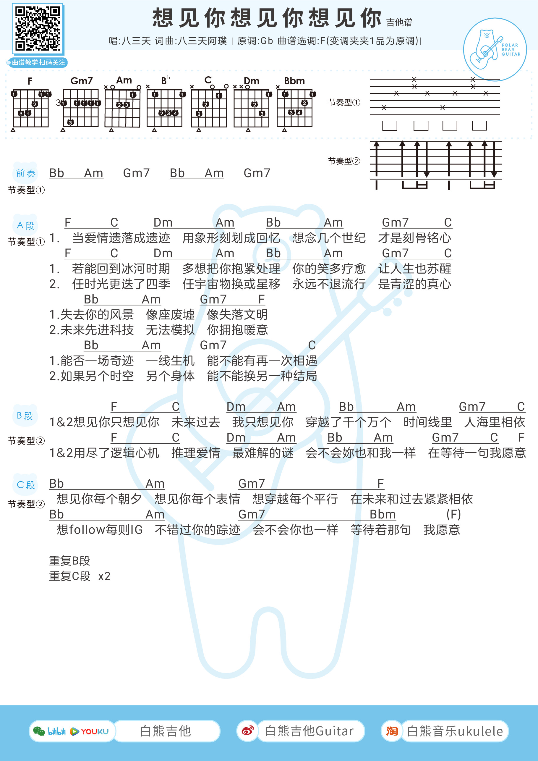 吉他八三夭《想见你想见你想见你》吉他谱 F调和弦谱
