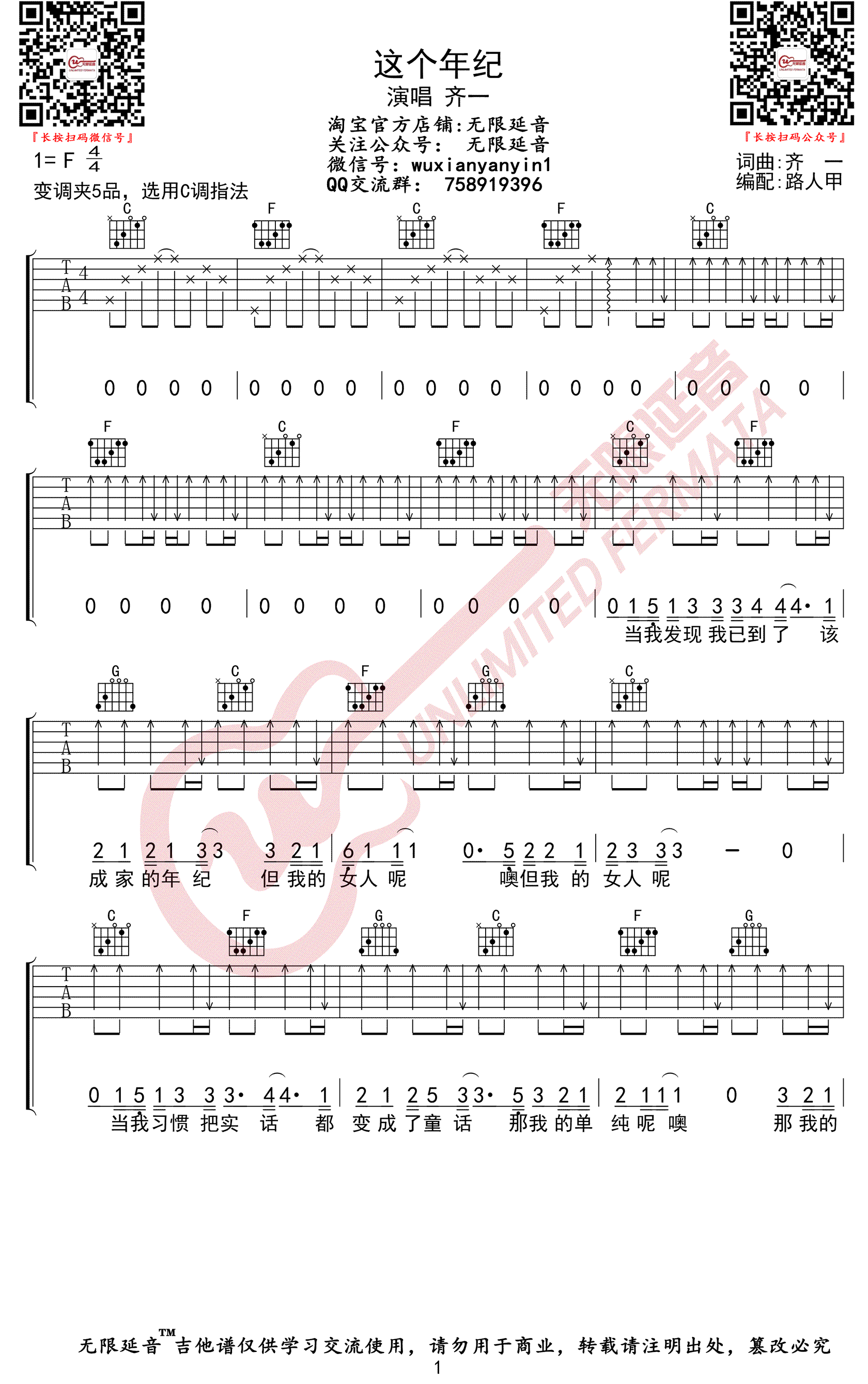 《这个年纪》吉他谱,齐一词曲原创的一首民谣歌曲,这个年纪六线谱,原调F,选用C调和弦指法,变调夹夹五品。无限延音编配制谱...