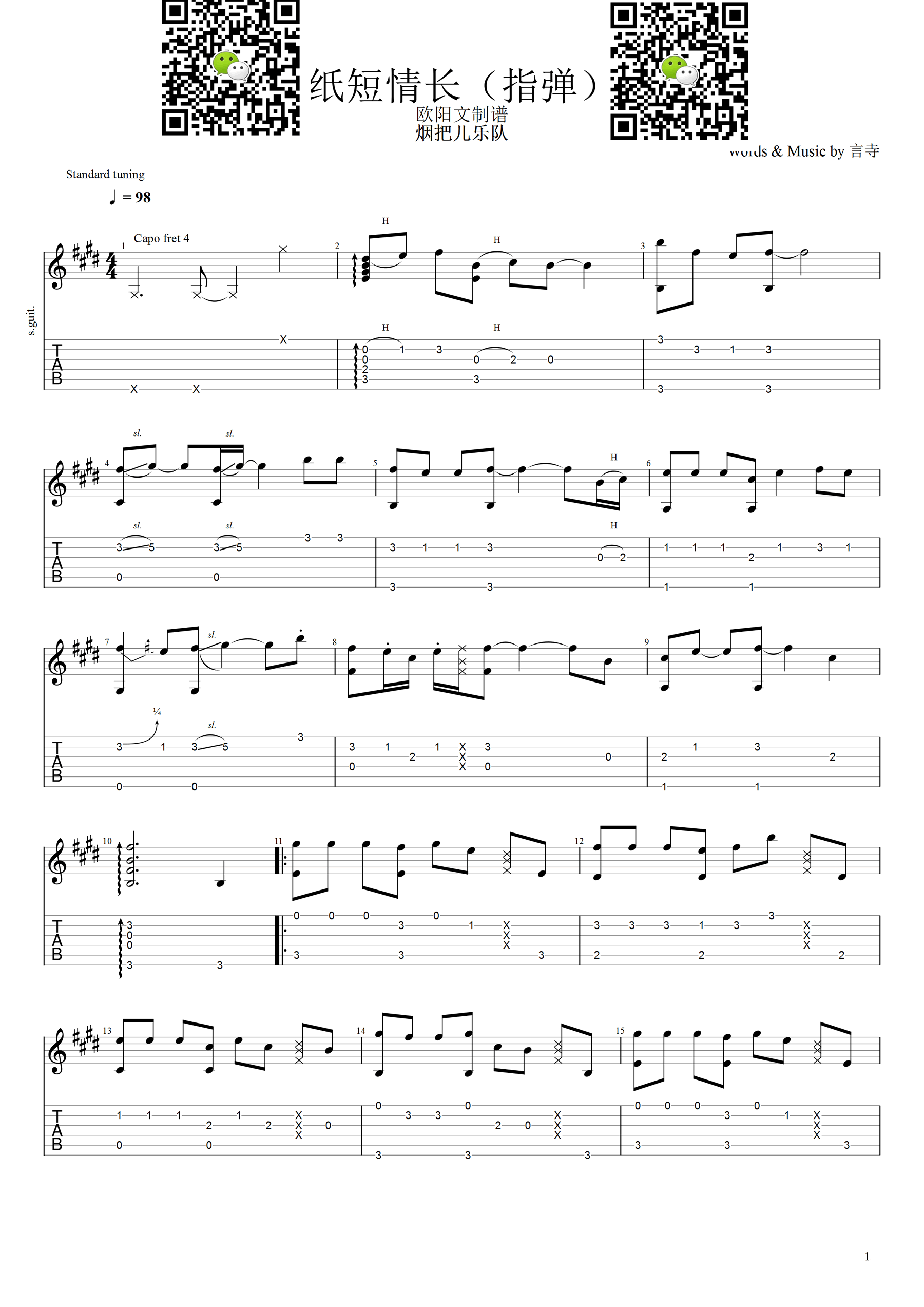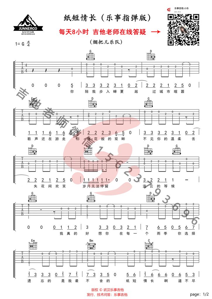 吉他烟把儿乐队《纸短情唱》吉他谱 G调指弹谱