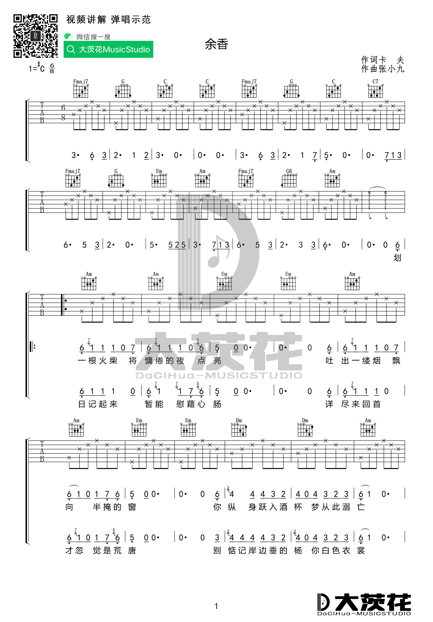 《余香》吉他谱,张小九演唱的一段悲伤的爱情故事,一首前任才成全的苦情歌。余香吉他六线谱,两张弹唱图片谱。大茨花音乐工作室出品...