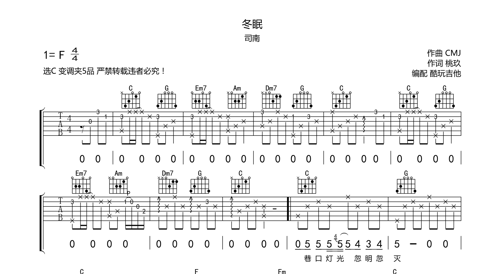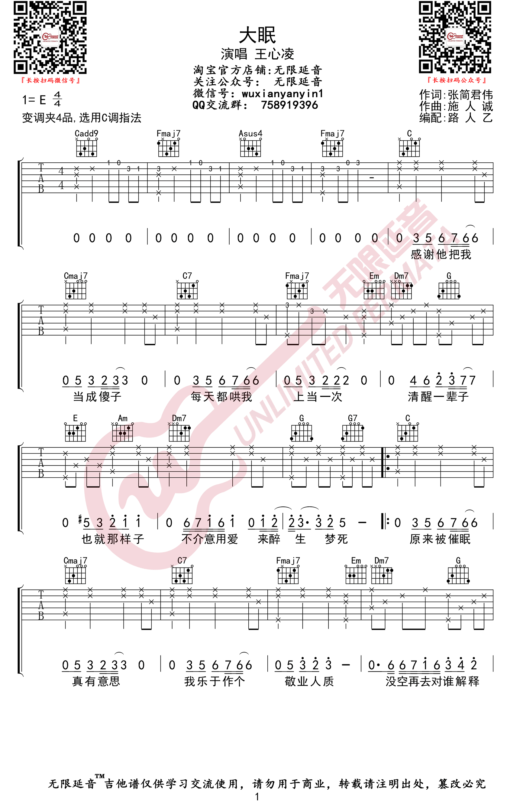 ,原调E,变调夹夹第四品,选用C调指法。三张高清弹唱图片谱,无限延音制谱分享...