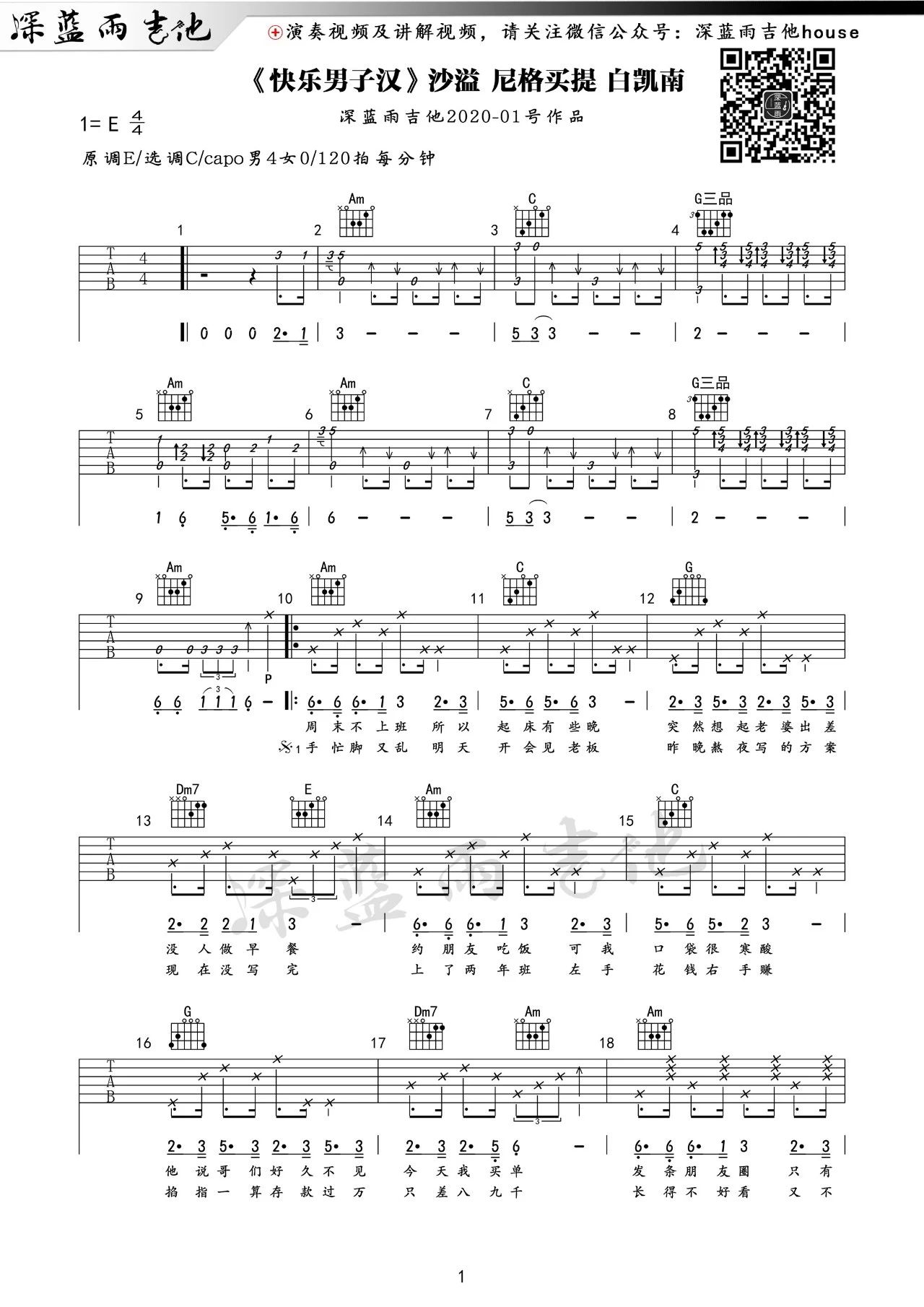 吉他沙溢/尼格买提/白凯南《快乐男子汉》吉他谱 C调弹唱谱