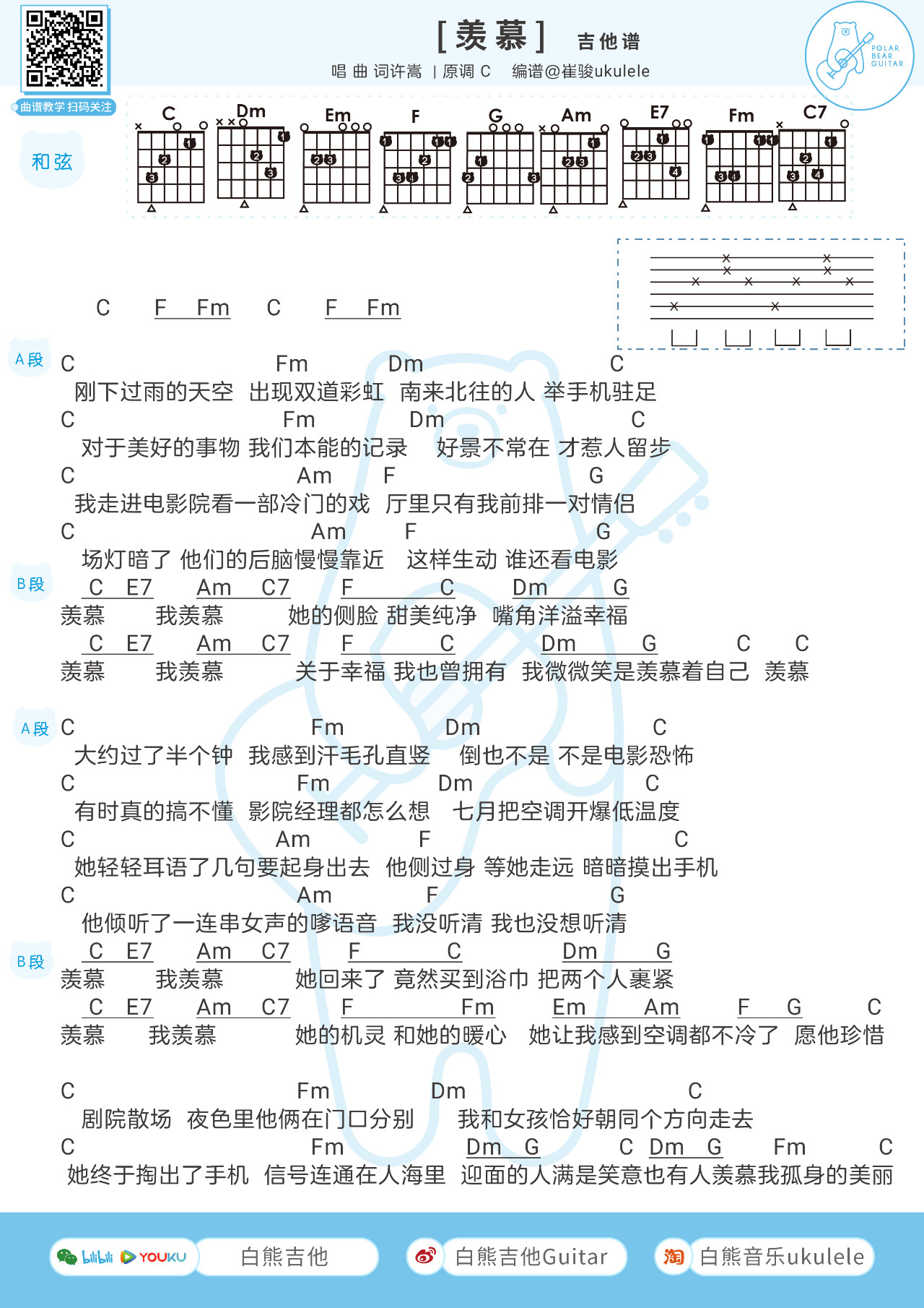 吉他许嵩《羡慕》吉他谱 C调和弦谱