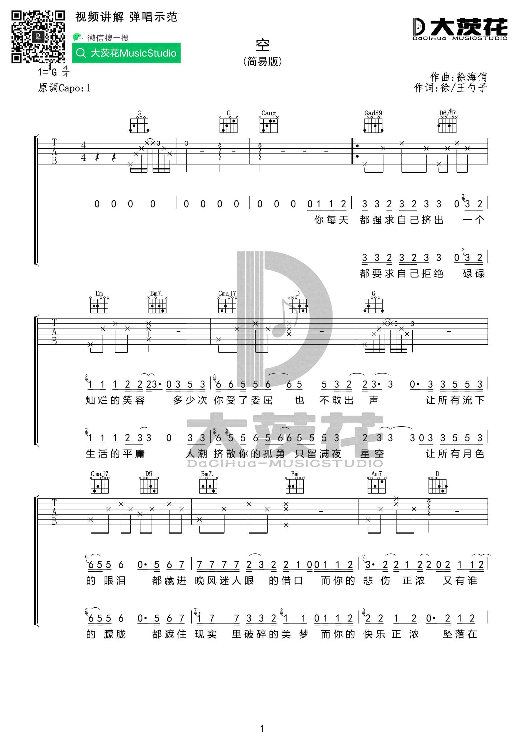 《空》吉他谱,徐海俏词曲创作演唱。人世漫长得转瞬即逝,当你将万物视做繁星,那所有的琐事便不再重要。一首好听的歌曲,送给所有正处在谷底的人们。...