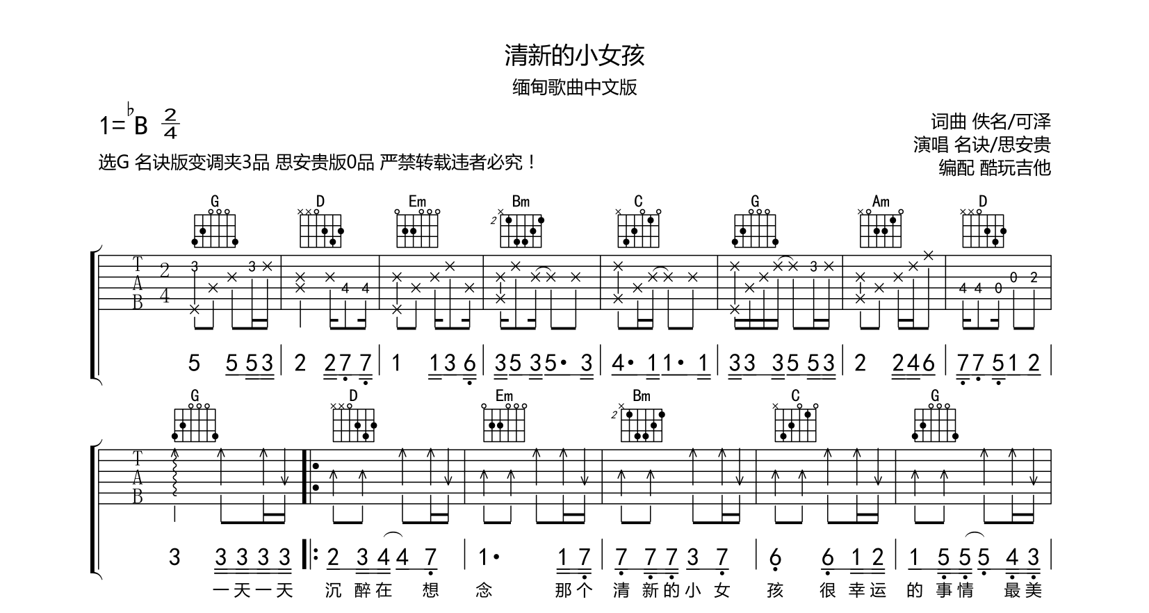 清新的小女孩吉他谱思贵安/名诀缅甸歌曲中文版有争议说是出自泰国名诀中文版变调夹3品思贵安版不夹适合高音演唱音频为手机录制只是录制了第一遍附完整前奏间奏尾奏...