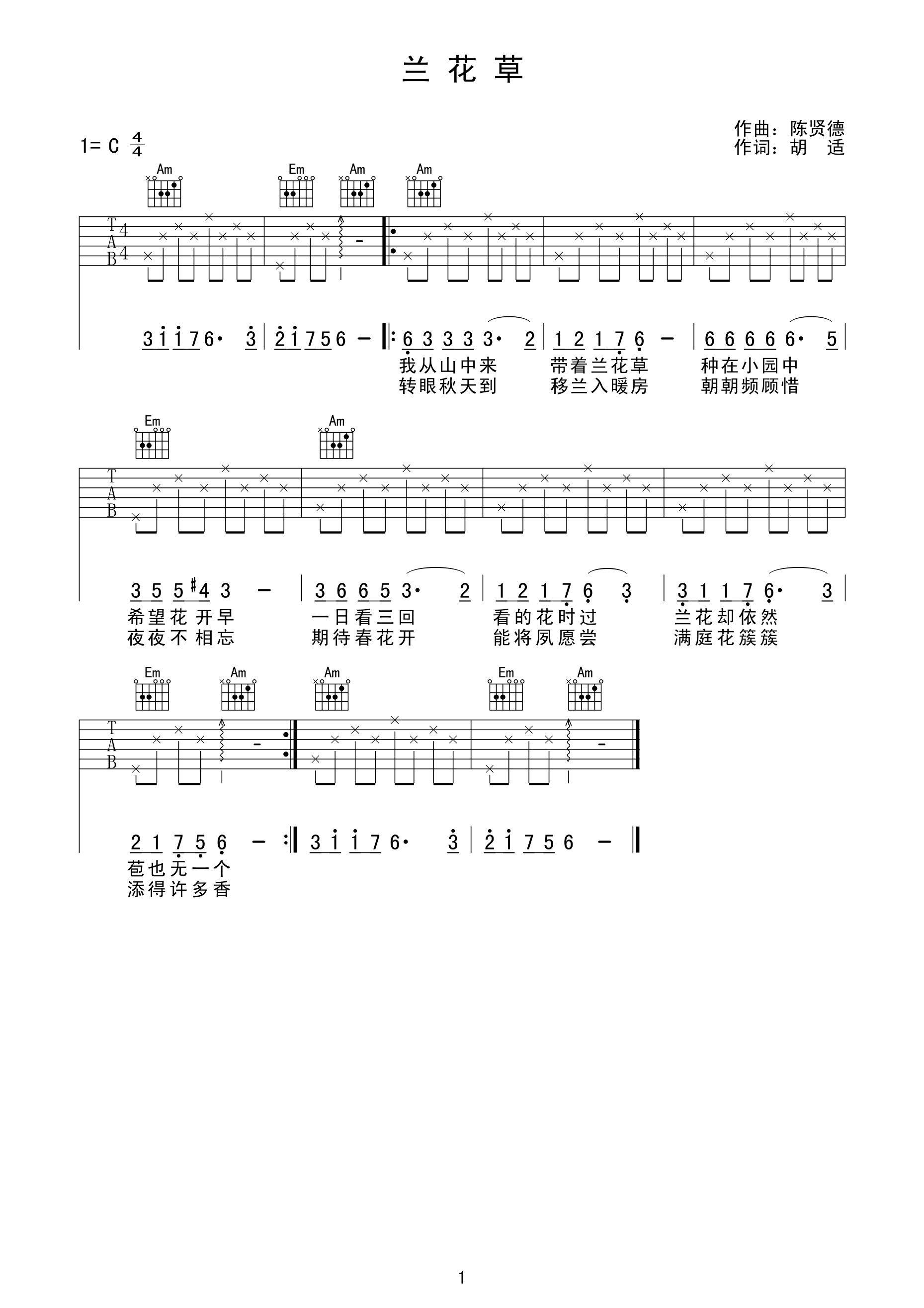 吉他兰花草 吉他谱 C调简单版