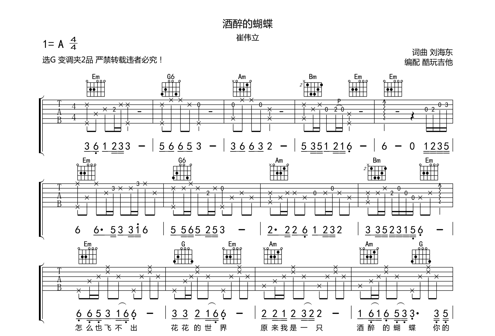 吉他酒醉的蝴蝶 崔伟立 吉他谱 完整版