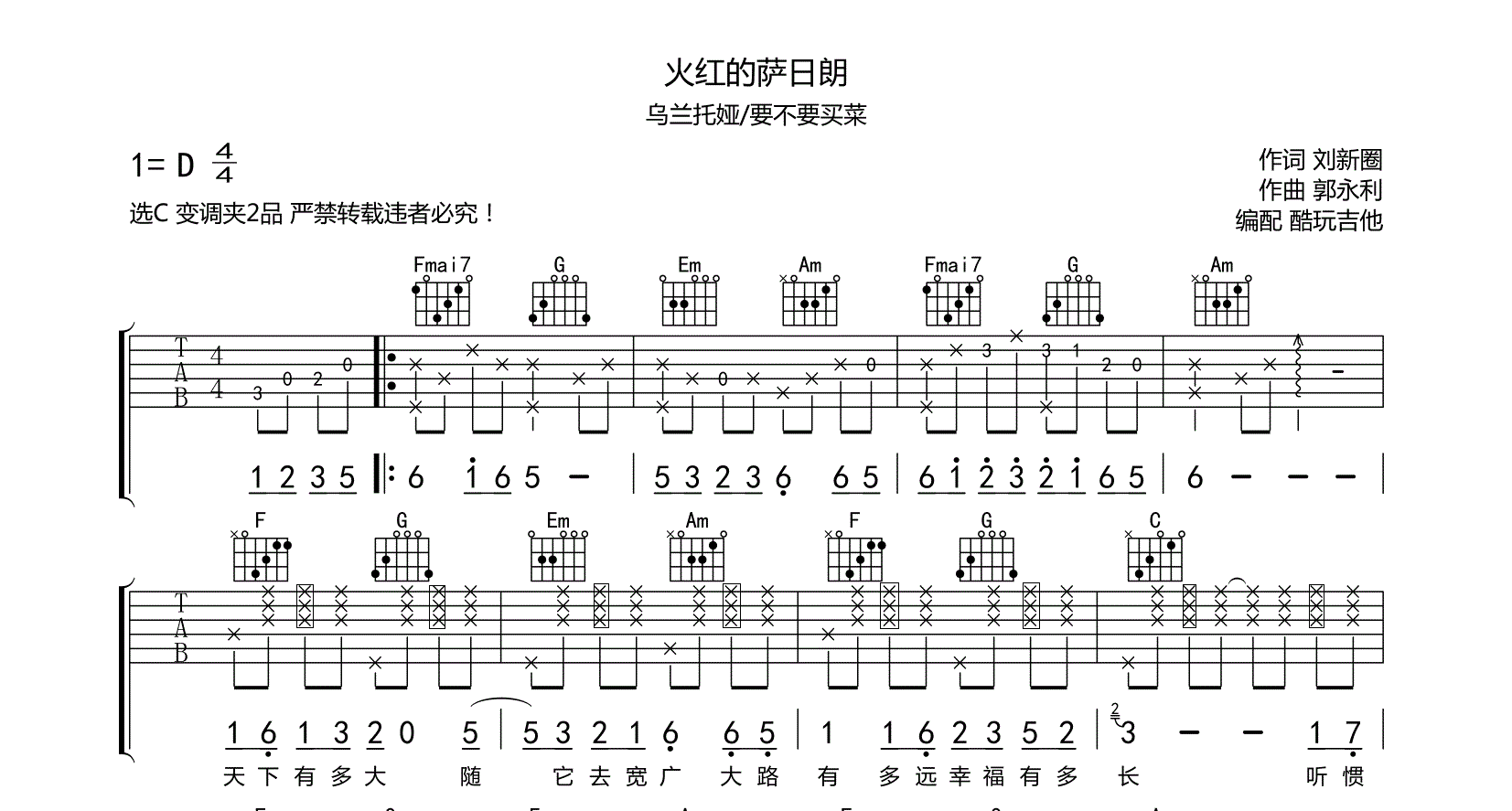 吉他火红的萨日朗 吉他谱 乌兰托娅/要不要买菜