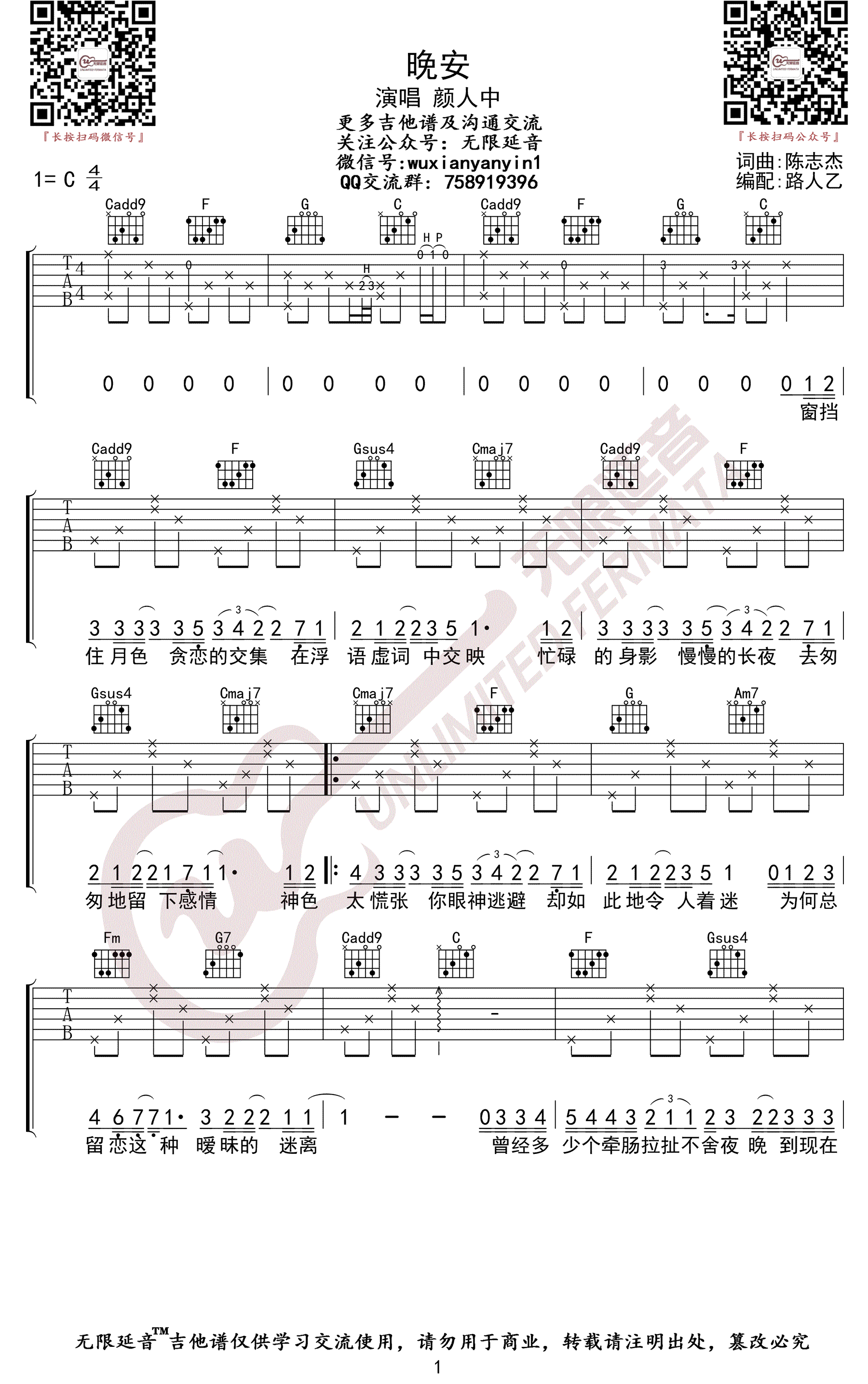 吉他颜人中 晚安吉他谱
