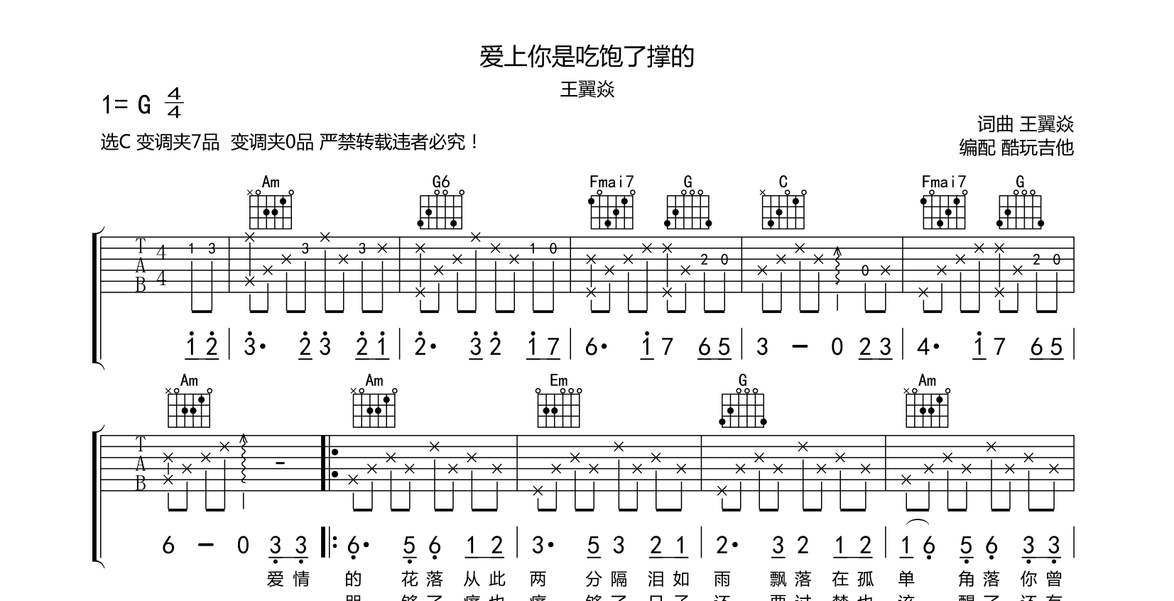 吉他爱上你是吃饱了撑的 吉他谱 王翼焱 完整还原版