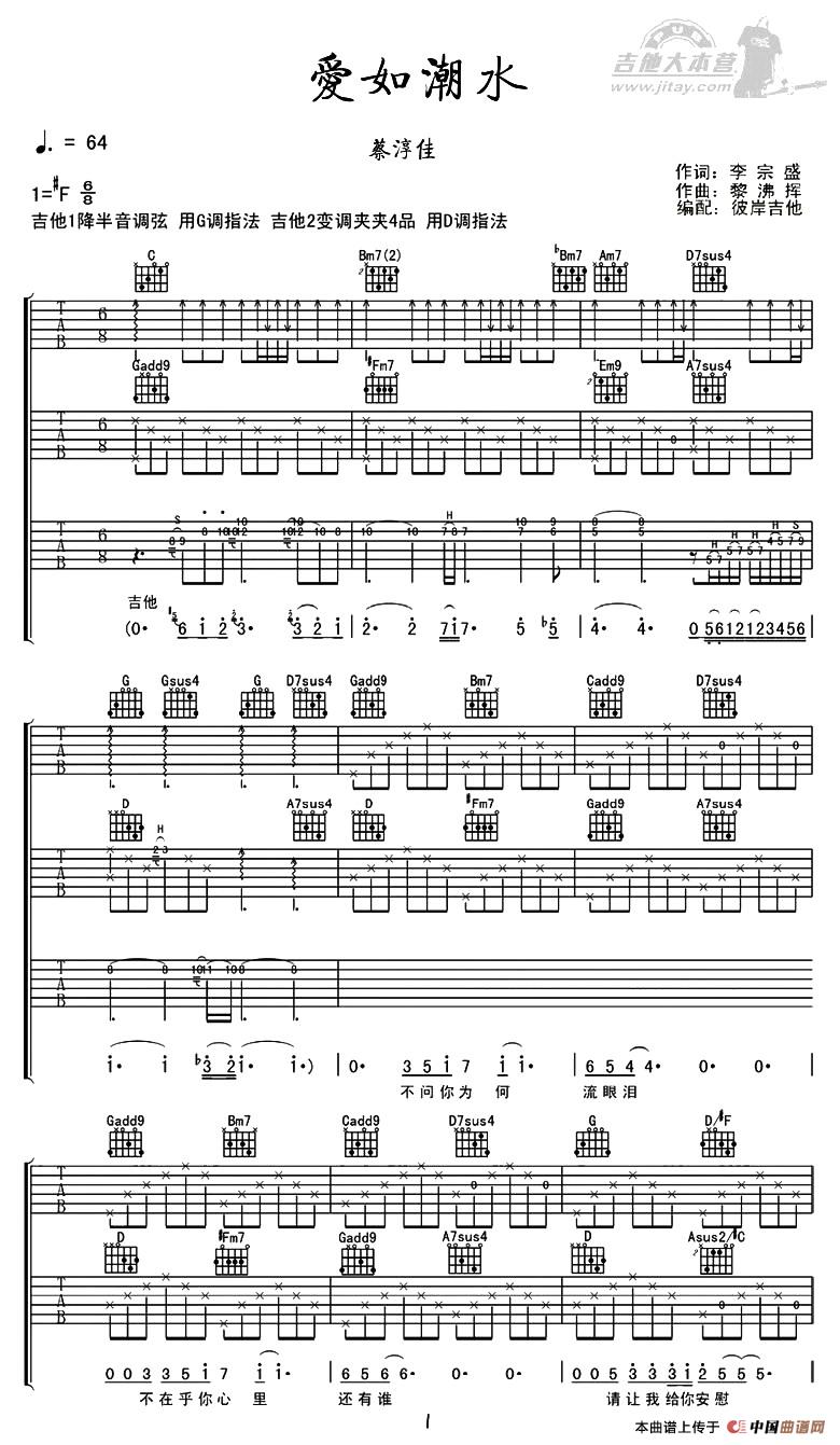 吉他爱如潮水 吉他谱(3把吉他版)