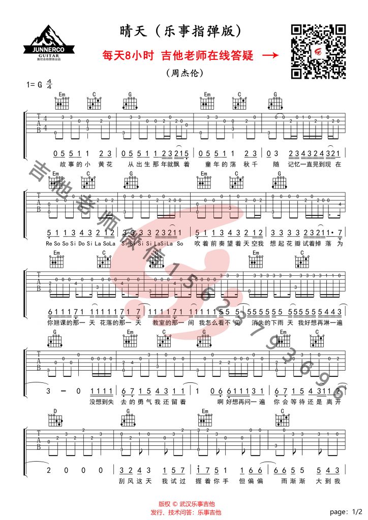 吉他晴天 吉他谱 弹唱和指弹两个版本 简单版