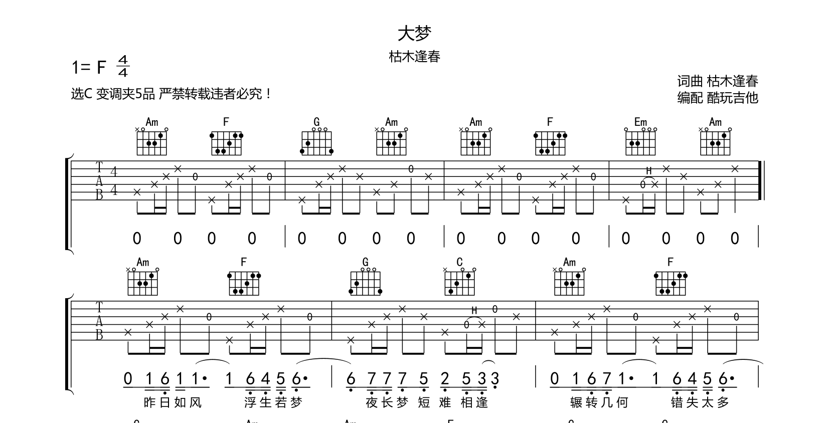 大梦吉他谱枯木逢春最新单曲原调F选C变调夹5品音频为手机录制只是录制第一遍...