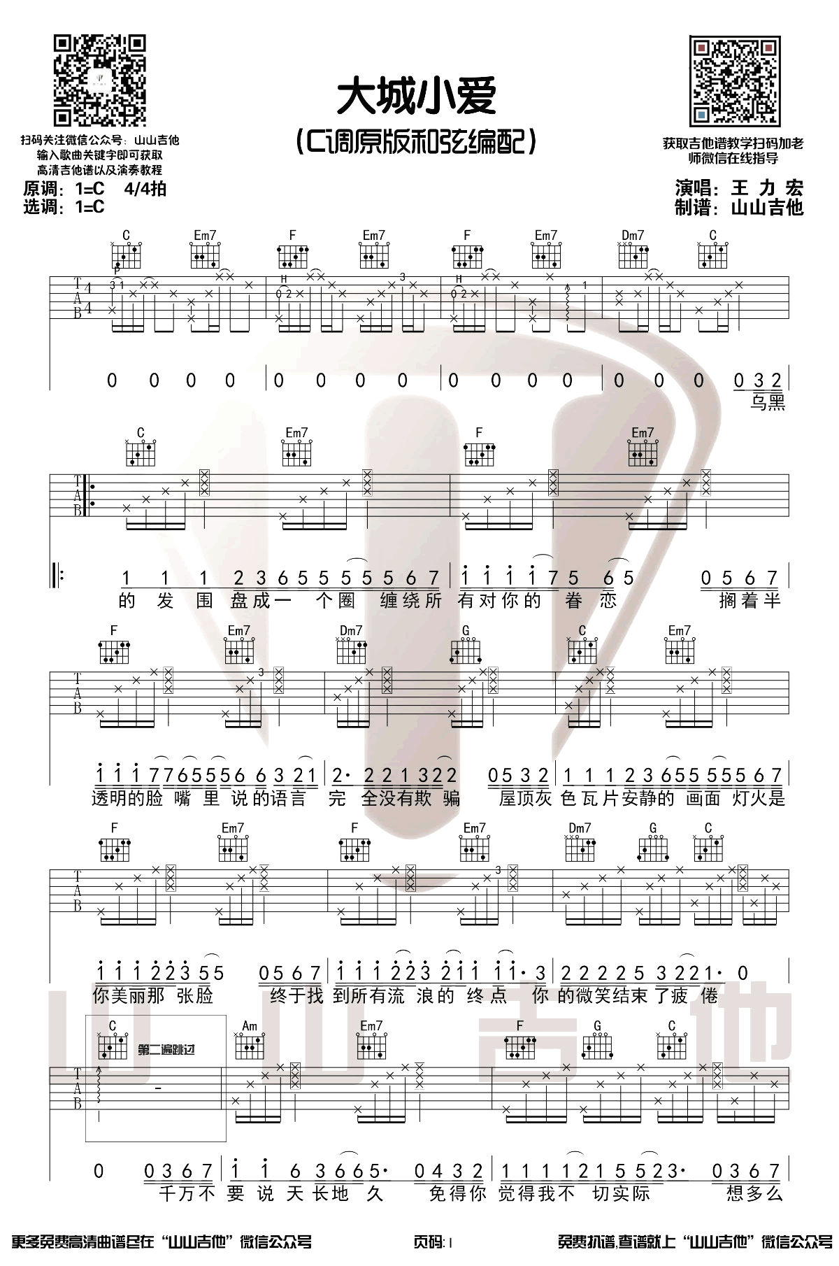 《大城小爱》吉他谱,王力宏2005年发行的经典歌曲,大城小爱六线谱,C调原版和弦编配...
