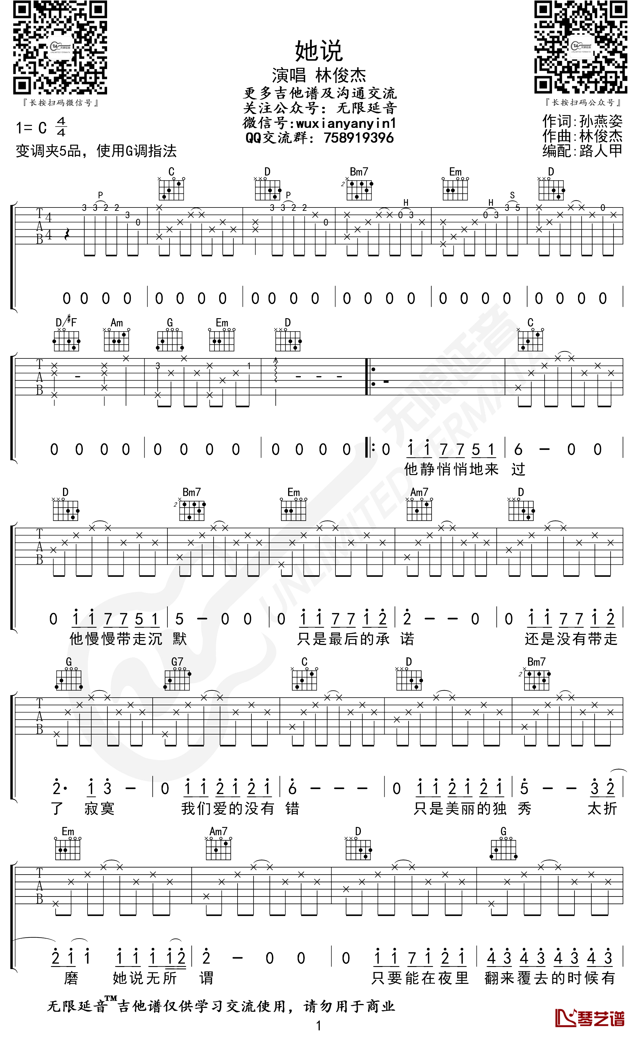 吉他她说吉他谱 G调简单版 林俊杰