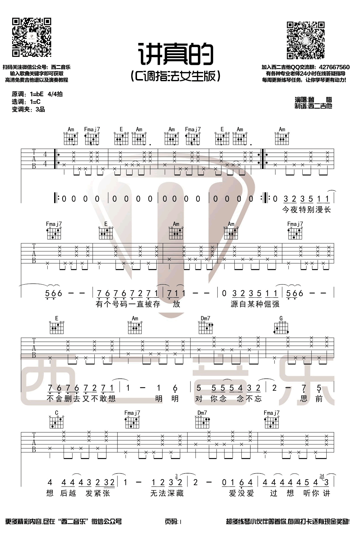 《讲真的》吉他谱,曾惜的一首网络热门歌曲,讲真的六线谱,C调指法女生版,变调夹夹三品,两张图片谱,山山吉他编配出品...