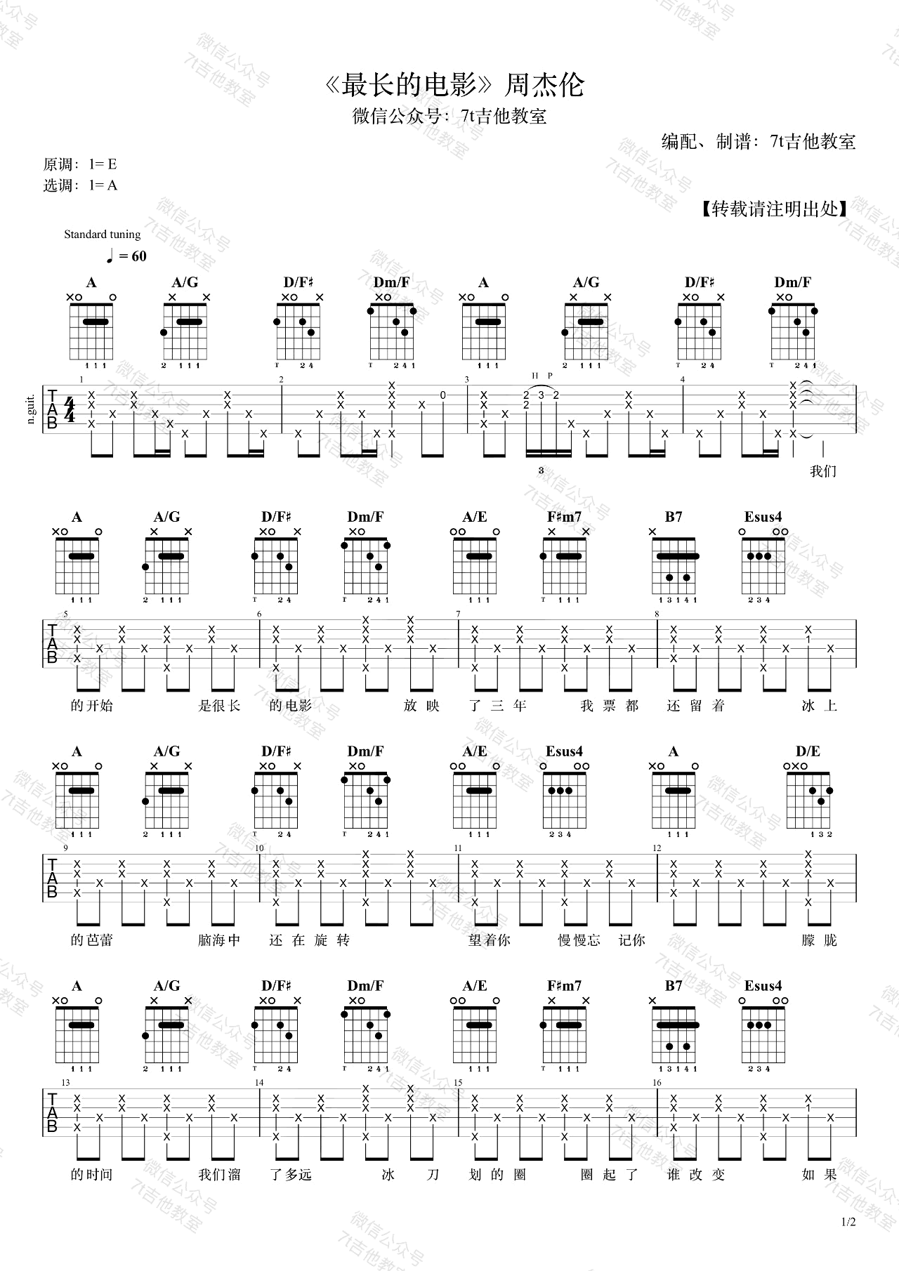 周杰伦《最长的电影》吉他谱,这首歌的原调是E大调,使用变调夹,夹在第1品,适合音域较低的男生~想唱原调的童鞋需要标准音调弦,使用变调夹,夹在第7品哦!感谢7T吉他教室编配出品。...