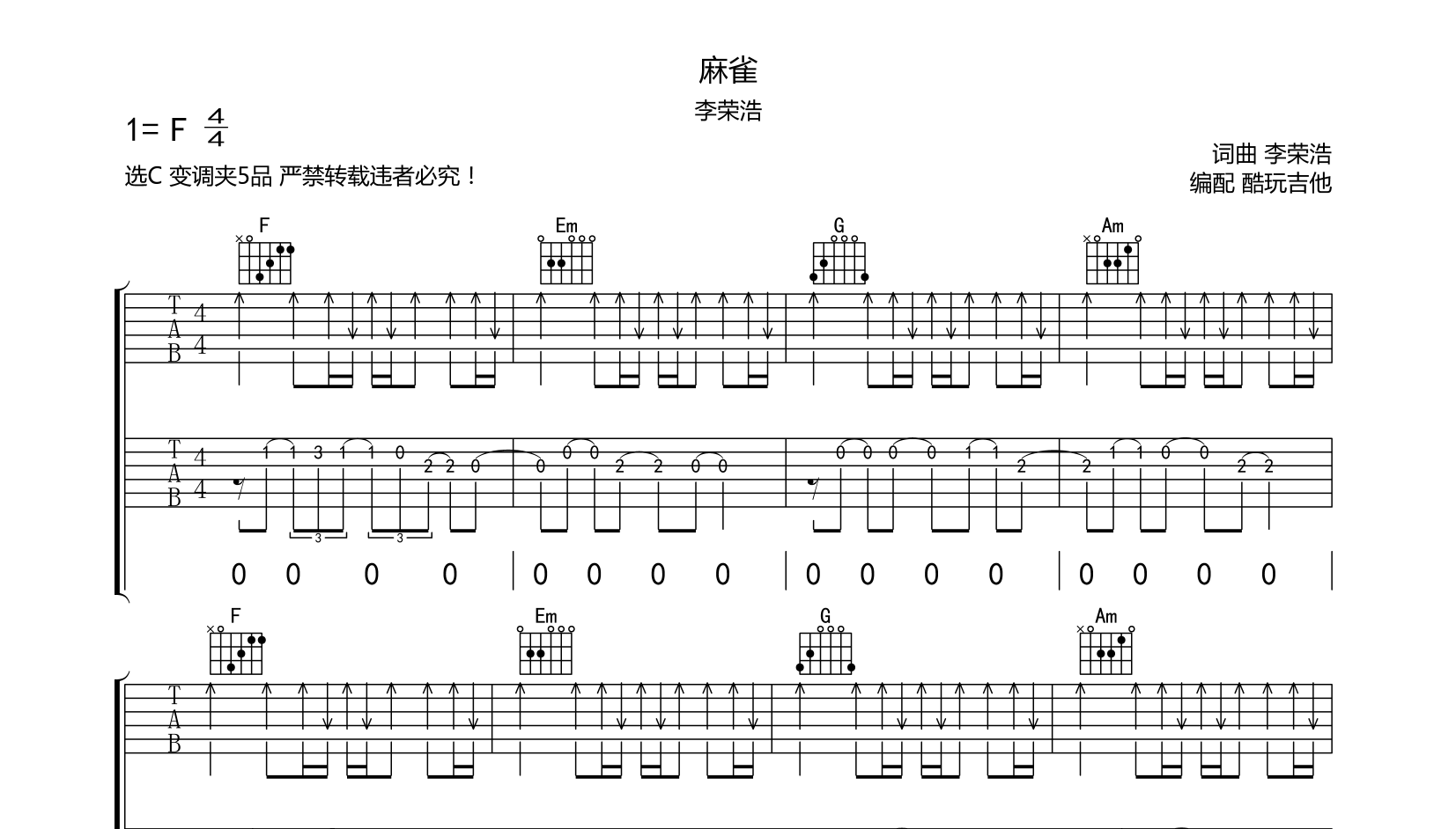 吉他麻雀 吉他谱 李荣浩 完整版 附前奏间奏尾奏