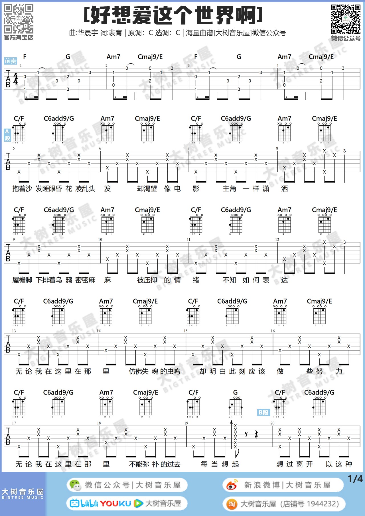 吉他华晨宇《好想爱这个世界啊》吉他谱 C调弹唱谱