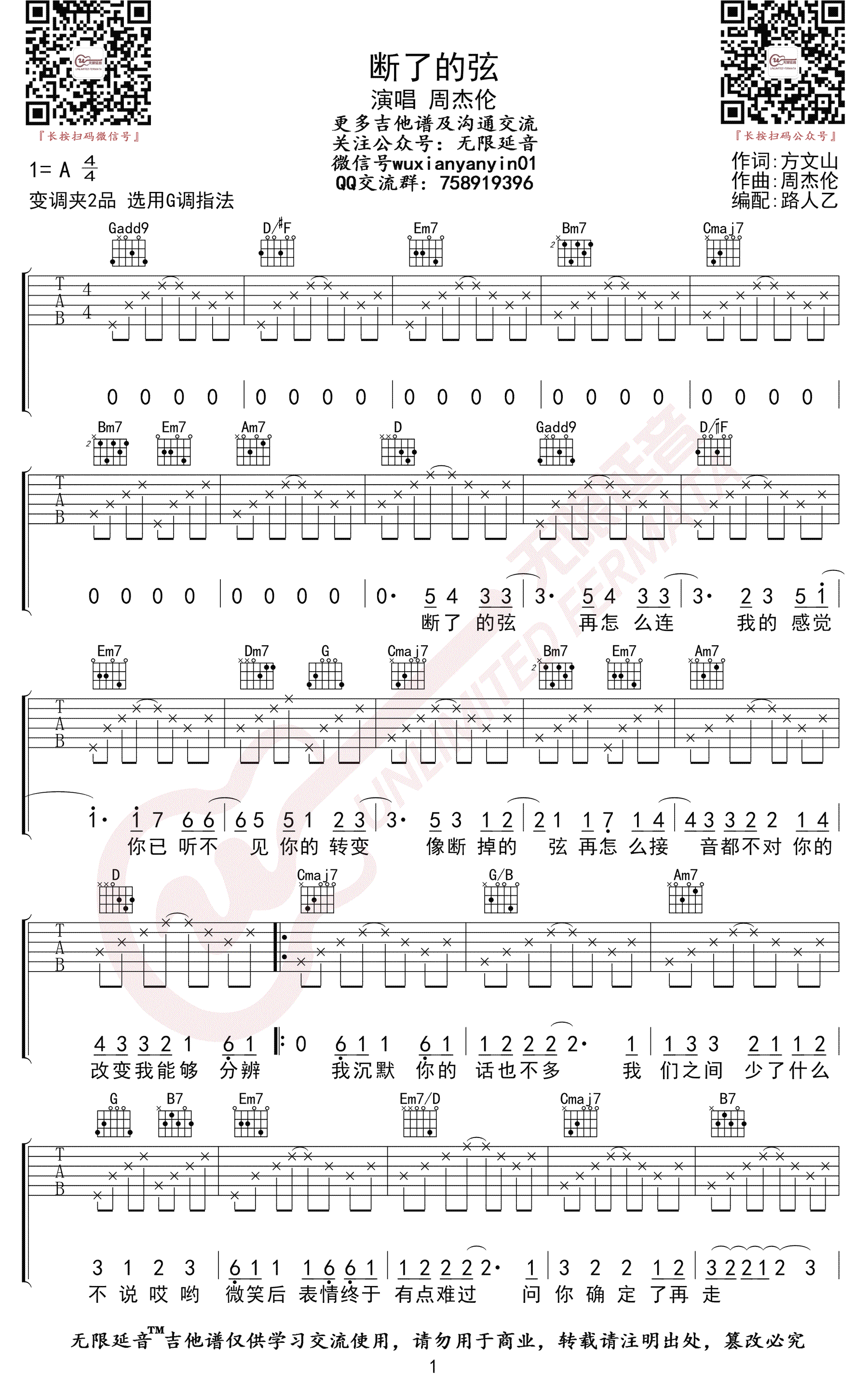 《断了的弦》吉他谱,周杰伦演唱的一首老歌,断了的弦六线谱,原调A,变调夹夹第二品,选用G调指法,无限延音编配出品...