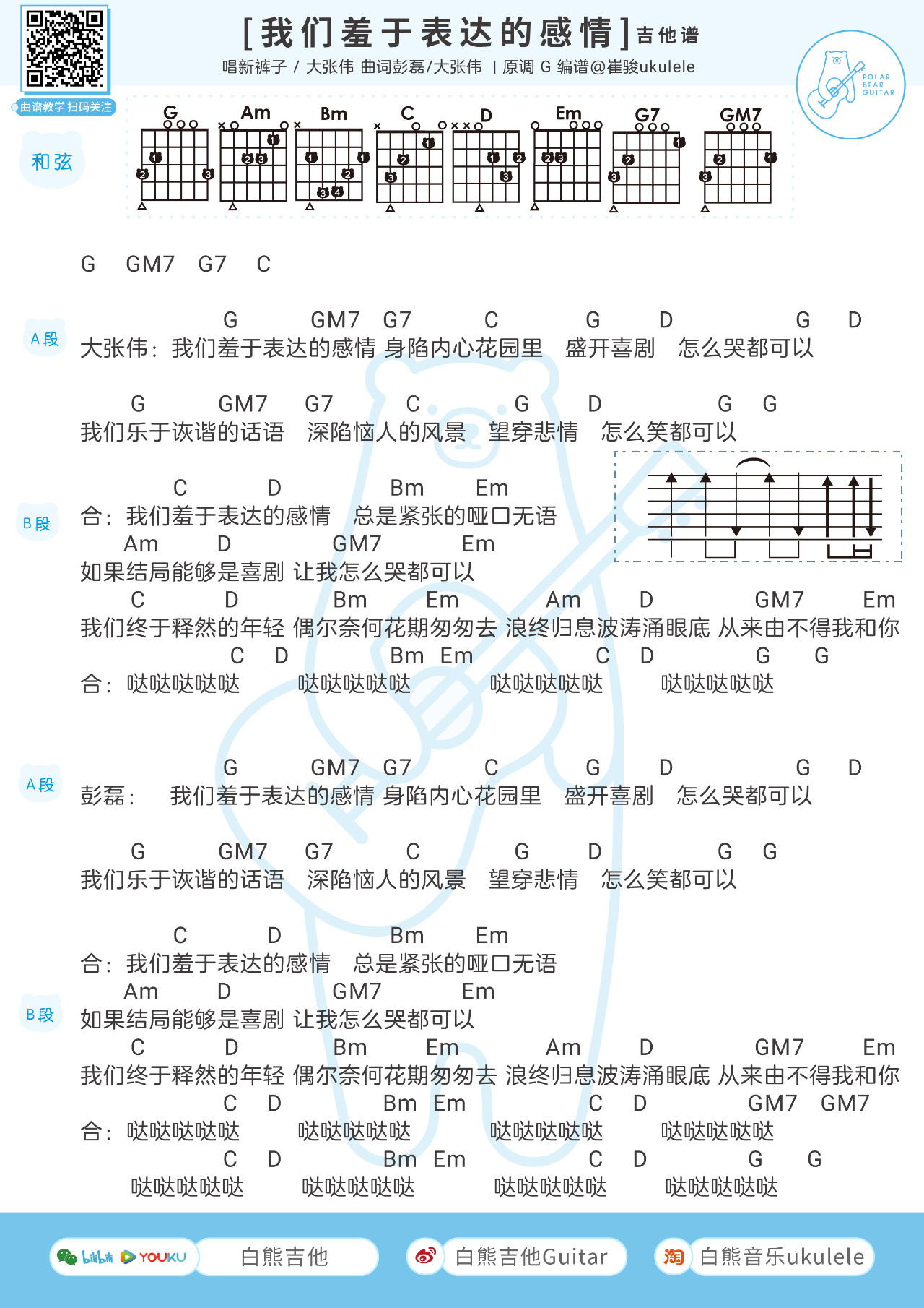 吉他大张伟&新裤子《我们羞于表达的感情》吉他谱 G调和弦谱附节奏