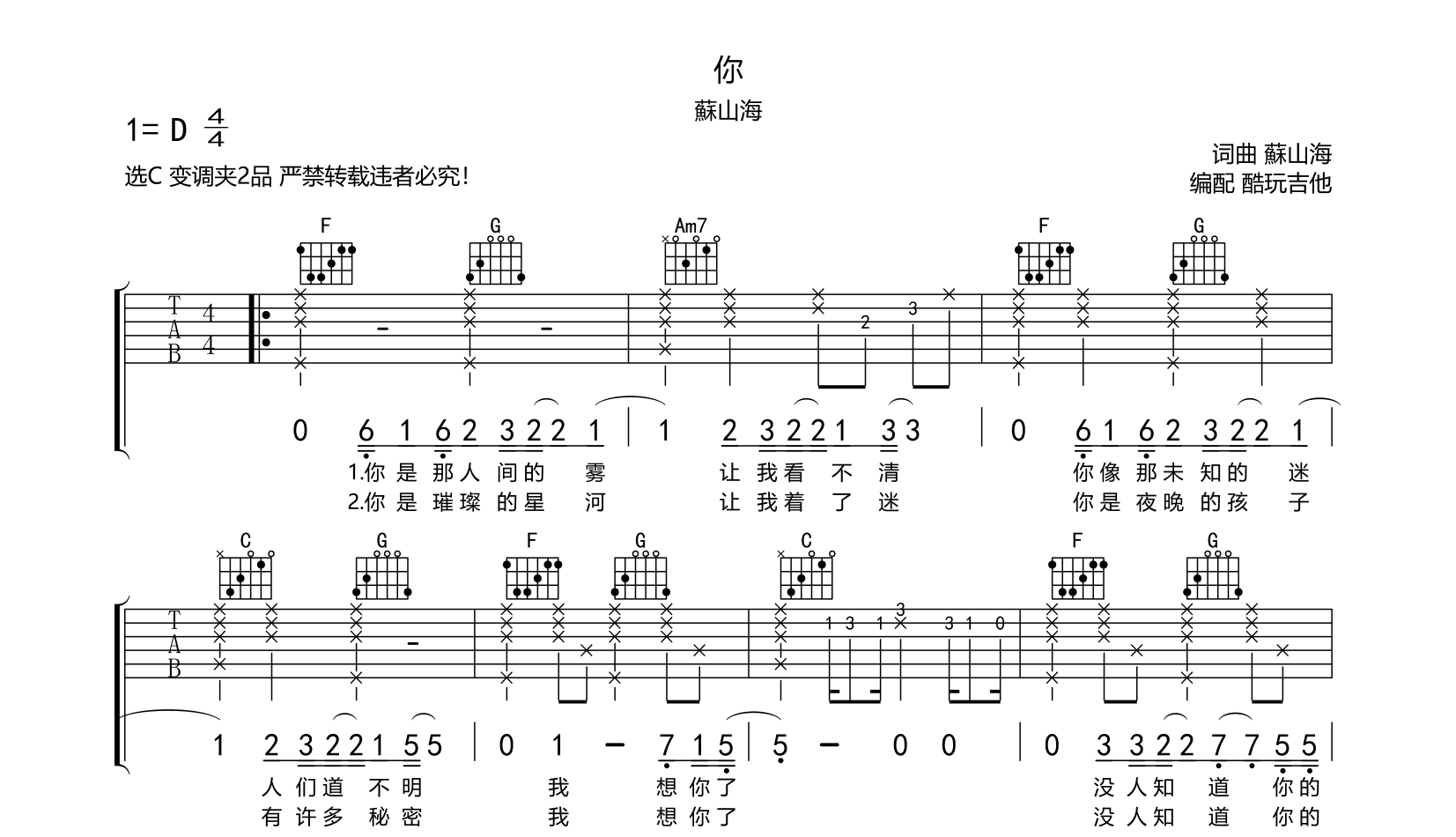 吉他你 吉他谱 蘇山海 C调弹唱谱