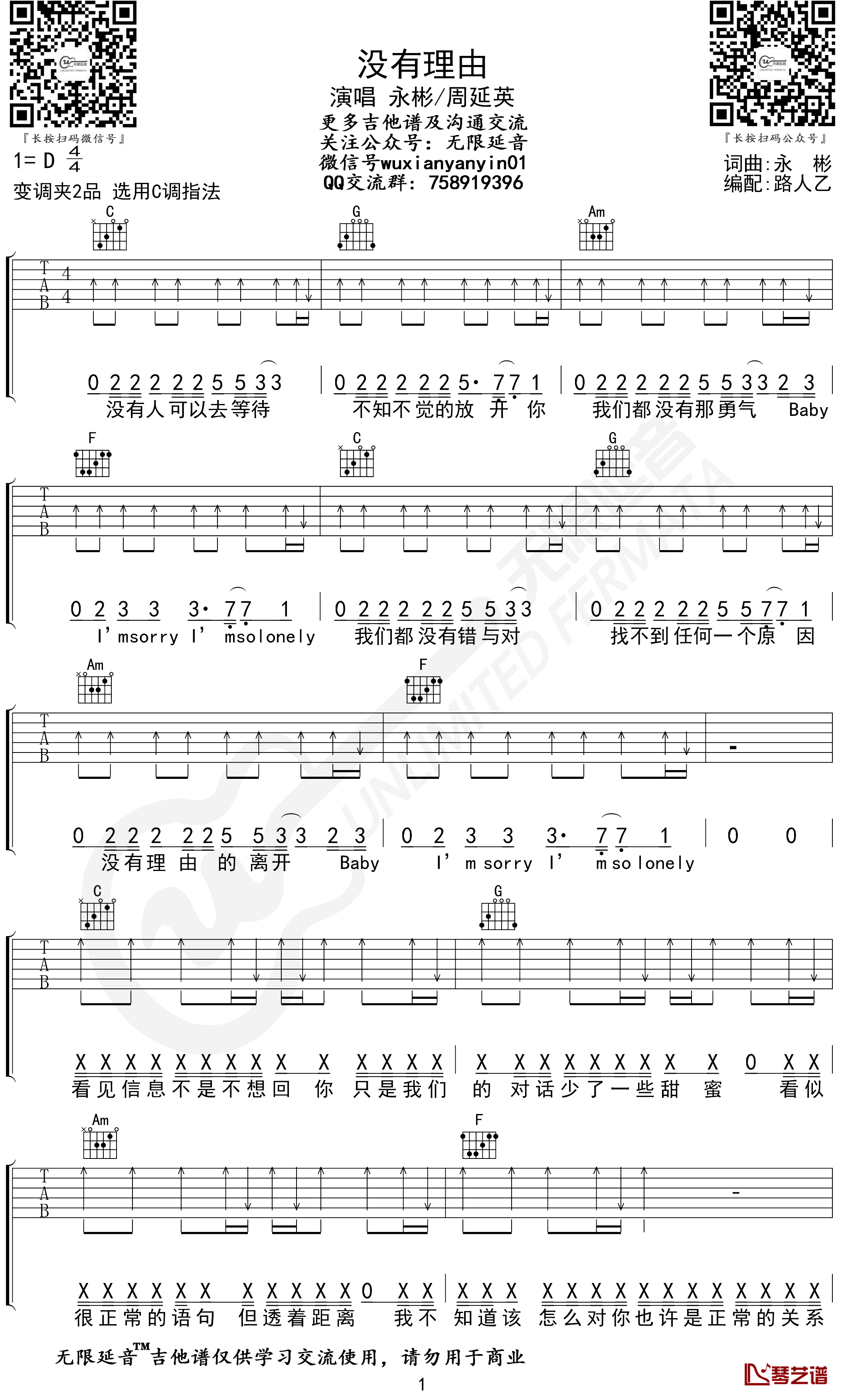 吉他没有理由吉他谱 永彬Ryan.B/周延英 C调弹唱六线谱 无限延音编配