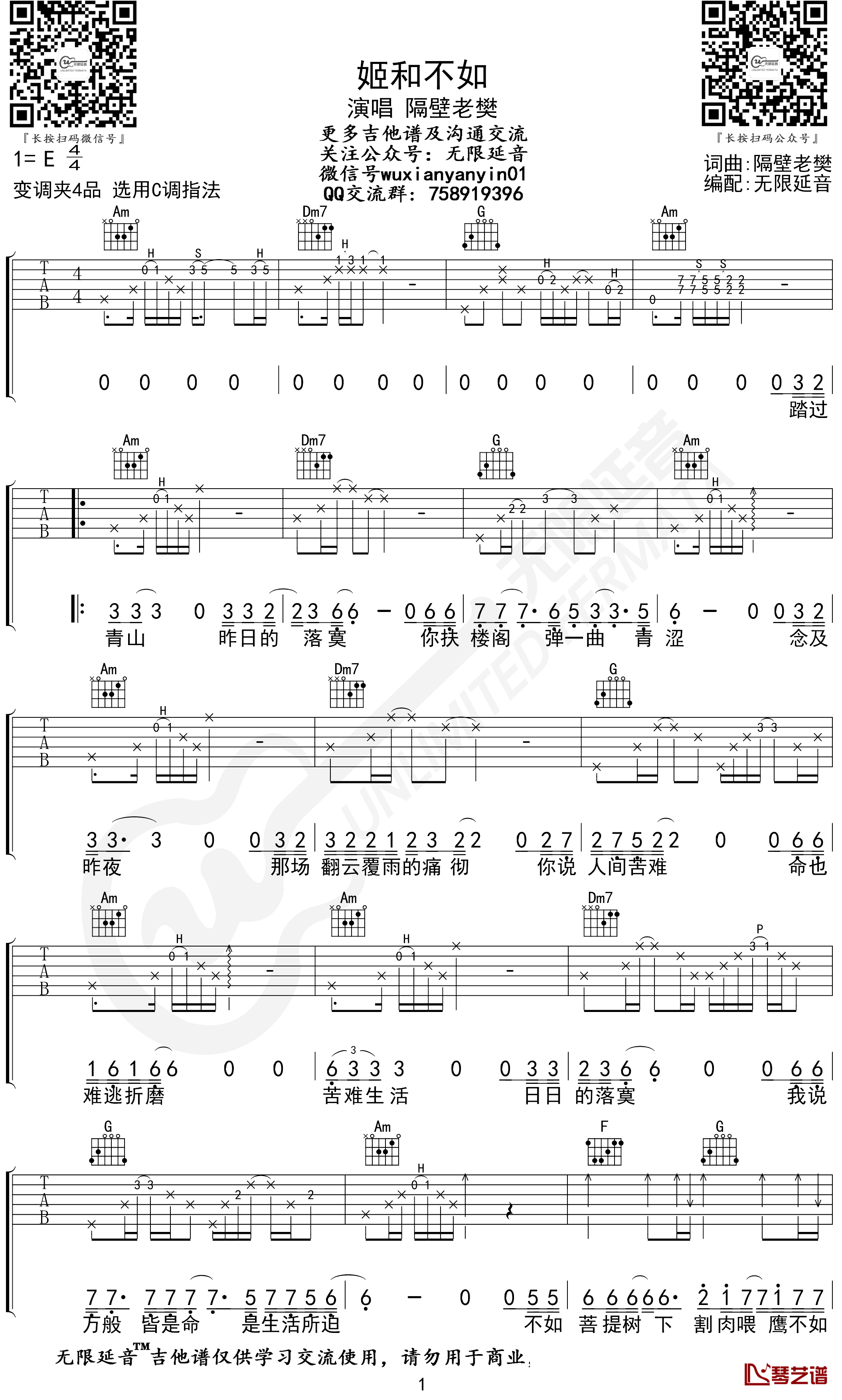 吉他姬和不如吉他谱 隔壁老樊 C调 无限延音编配