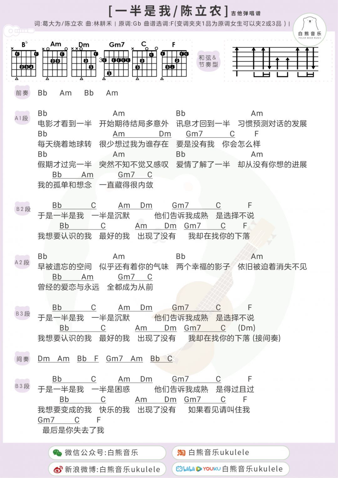 吉他陈立农《一半是我》吉他谱 F调和弦谱附节奏