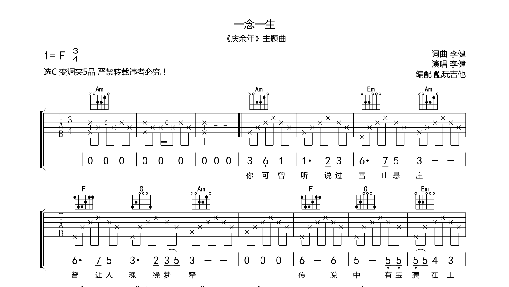 吉他一念一生 吉他谱 《庆余年》主题曲 李健