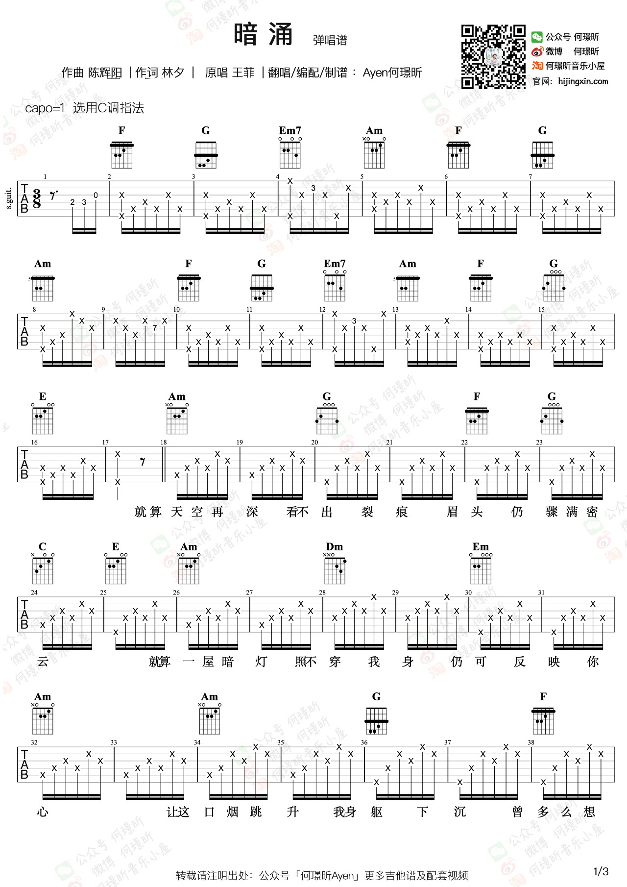 哭砂指弹吉他谱,根据张惠妹的一首经典歌曲改编。哭砂吉他独奏谱,CAPO夹三品,三张高清图片谱,感谢失物森林老师编配分享...