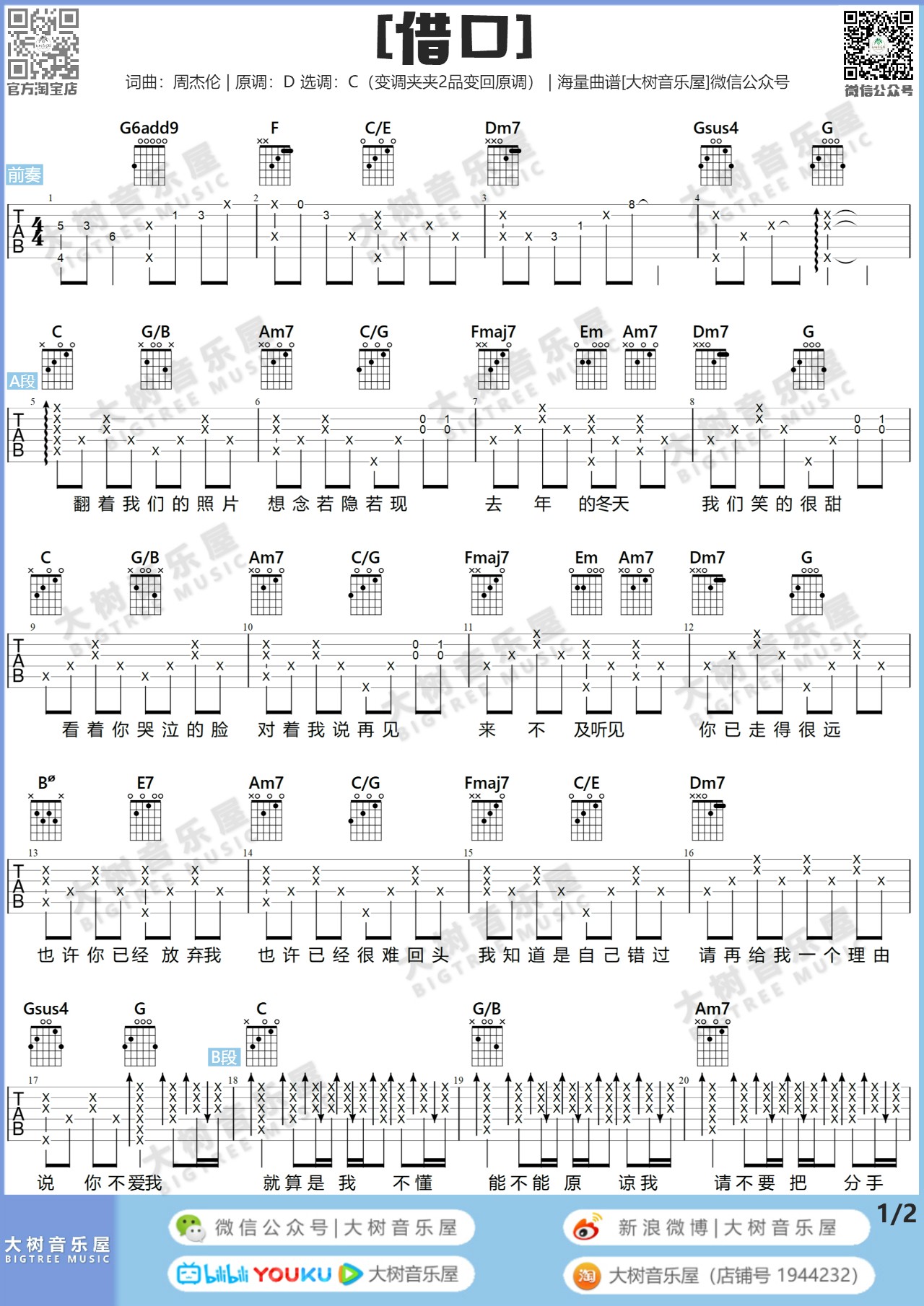 吉他周杰伦《借口》吉他谱 C调弹唱谱
