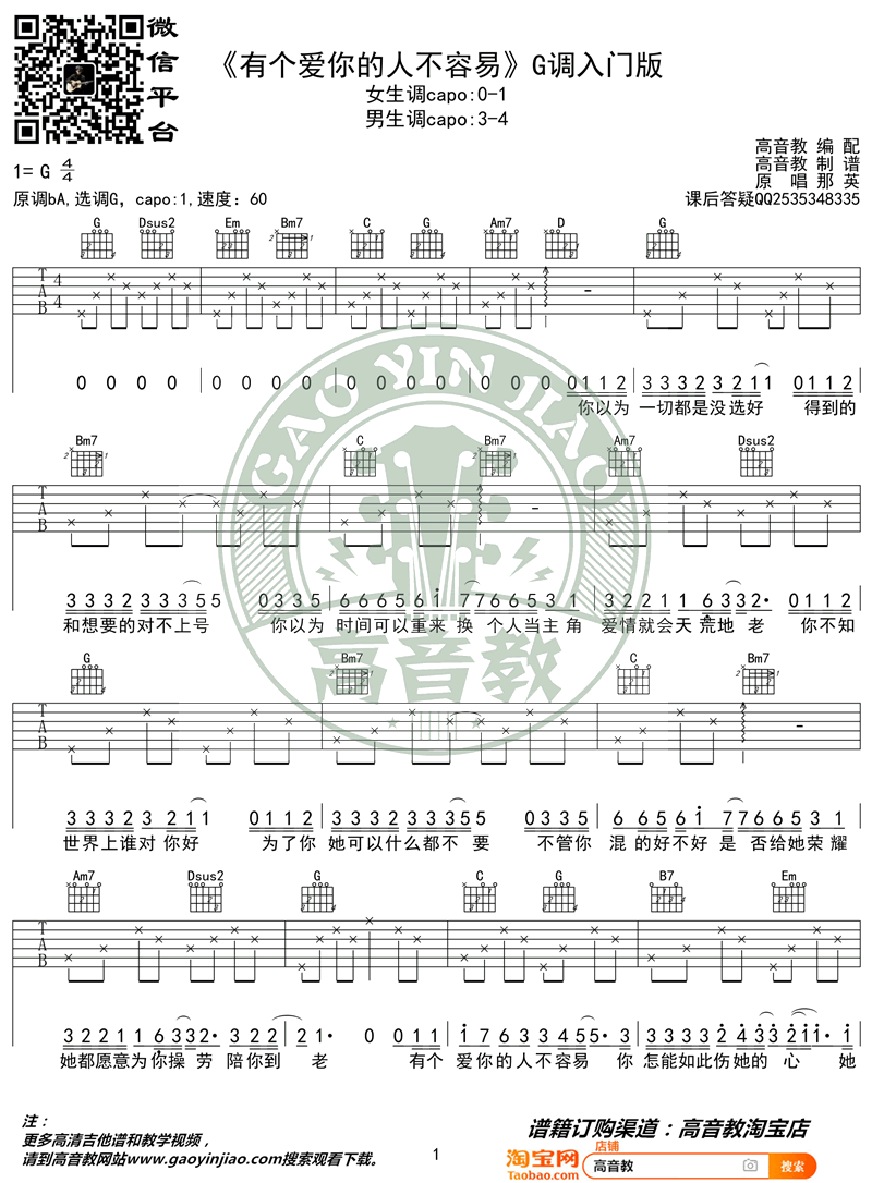 《有个爱你的人不容易》吉他谱,那英演唱,电影《夏洛特烦恼》主题曲,有个爱你的人不容易六线谱,原调bA,选调G,两张弹唱图片谱,感谢高音教制谱出品,易唱网上传分享。...