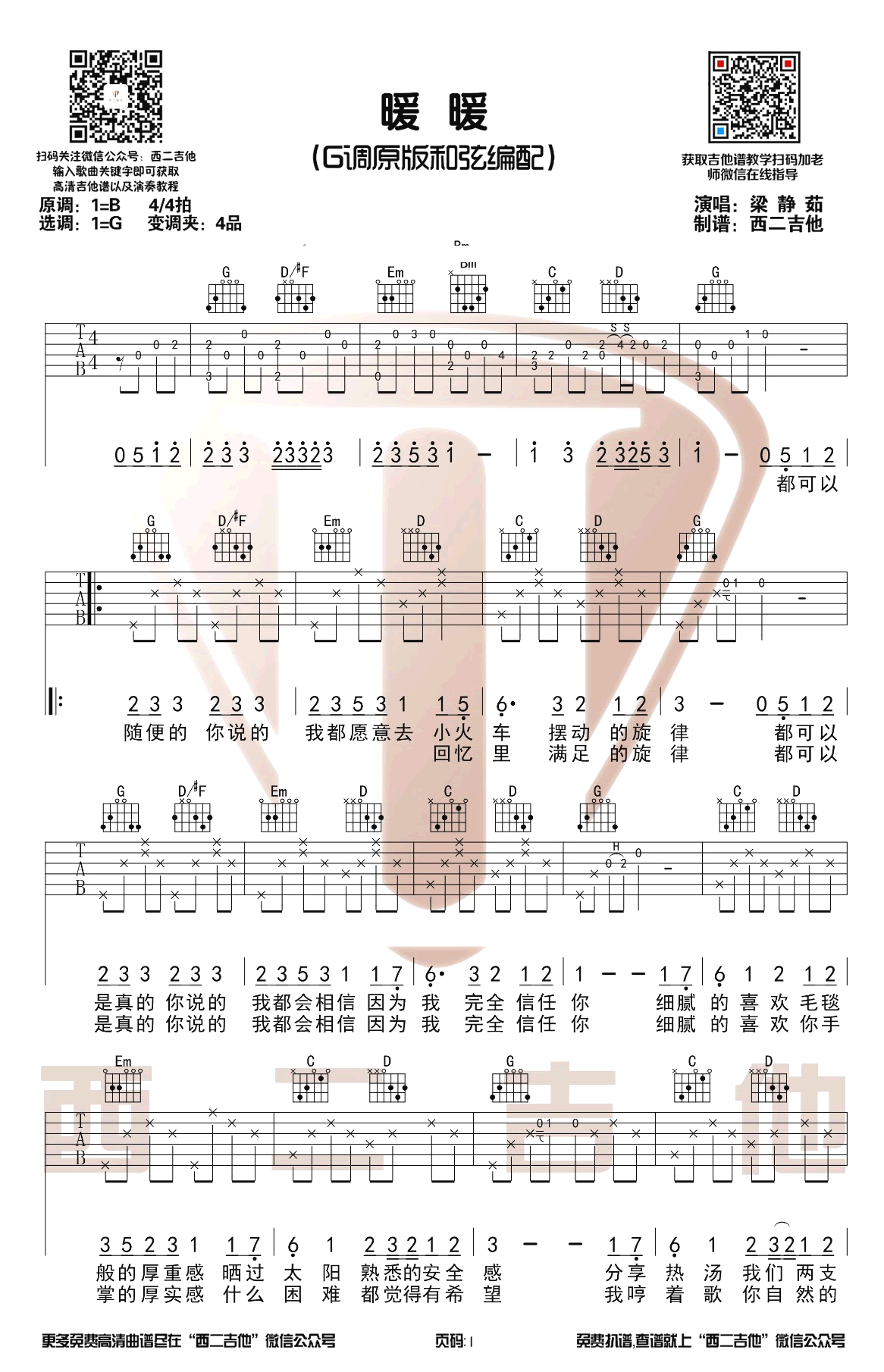 暖暖吉他谱,梁静茹的一首经典代表情歌作品,暖暖六线谱,G调原版和弦编配,变调夹夹第四品。带有原版的前奏,整体难度不大,西二吉他制谱出品...
