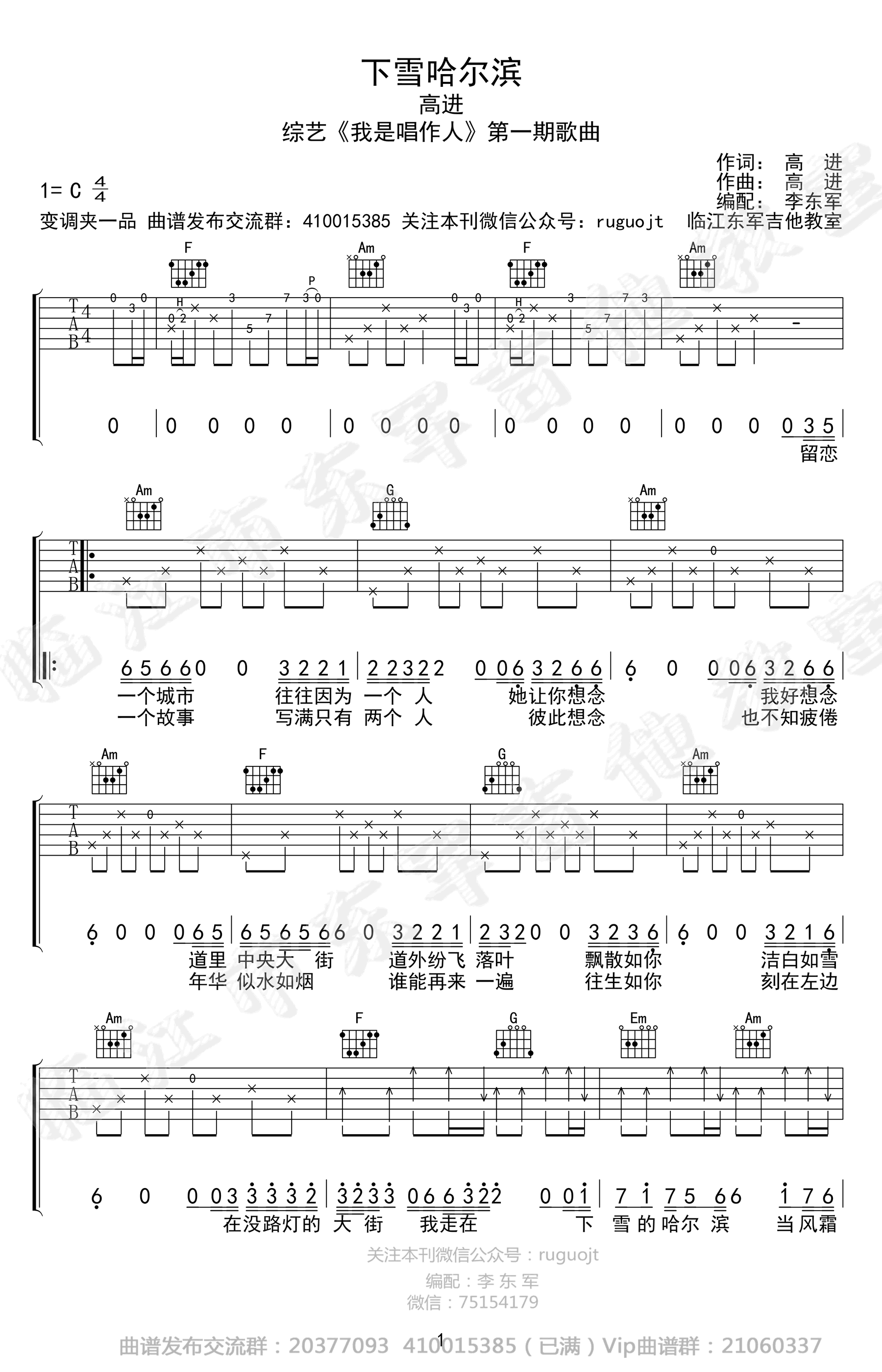 下雪哈尔滨吉他谱,高进《我是唱作人》第一期歌曲,下雪哈尔滨六线谱,完整版共四张高清图片谱,李东军编配制谱...