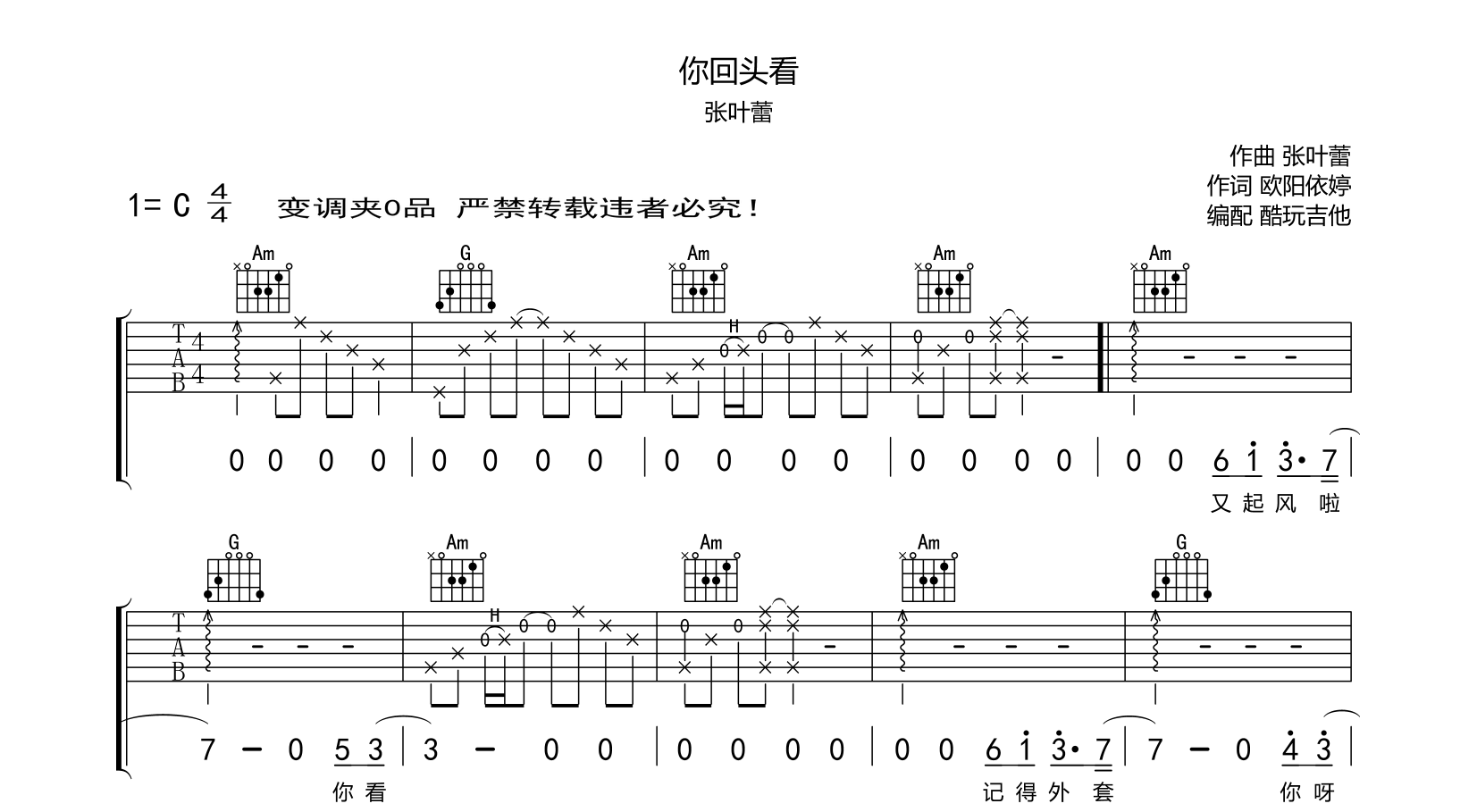 吉他你回头看 吉他谱 张叶蕾 琴友订制