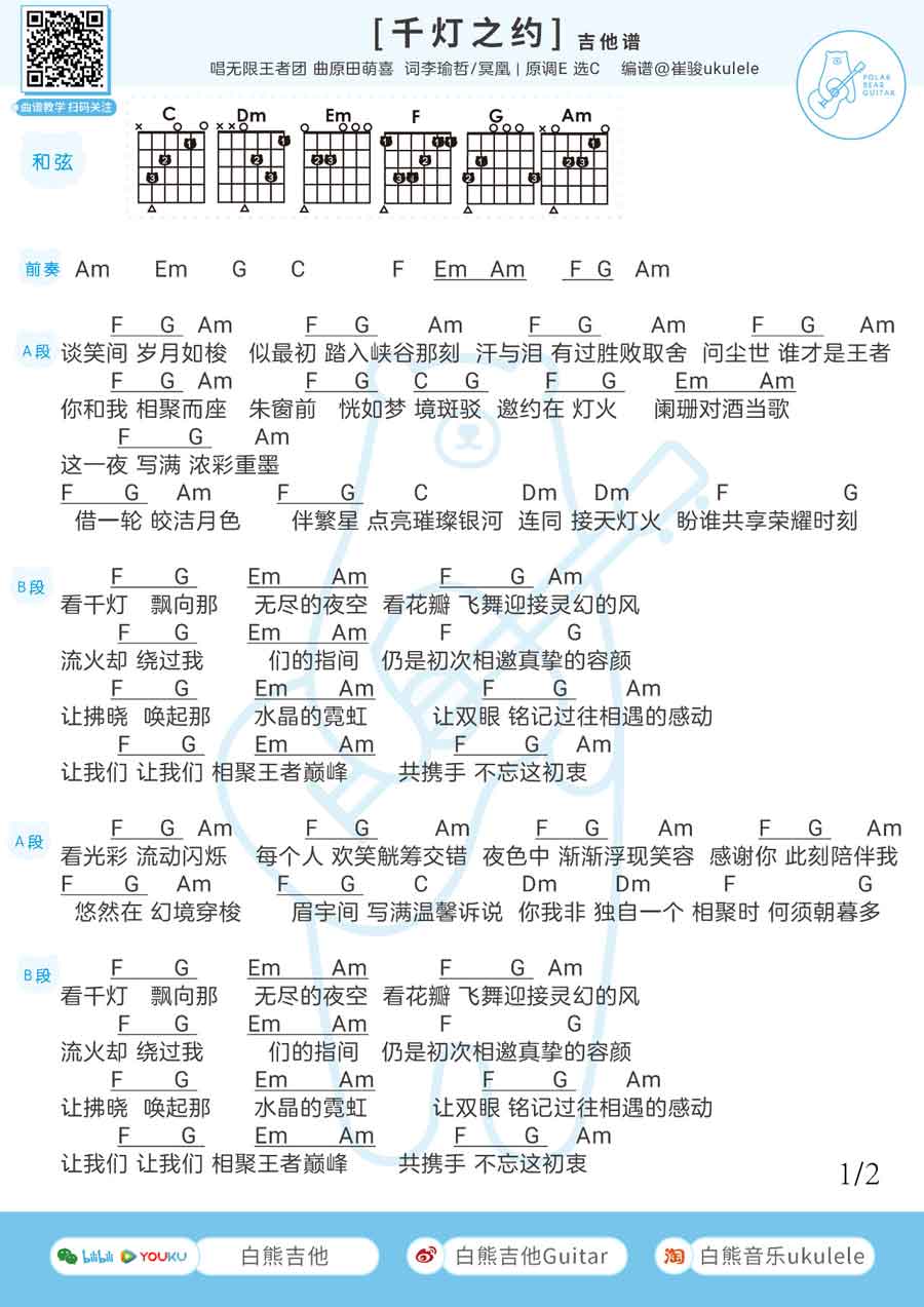 千灯之约吉他谱,原调:E调,选调:C和弦指法编配。无限王者团:千灯之约吉他弹唱谱,曲谱一共有两页图片六线谱。...