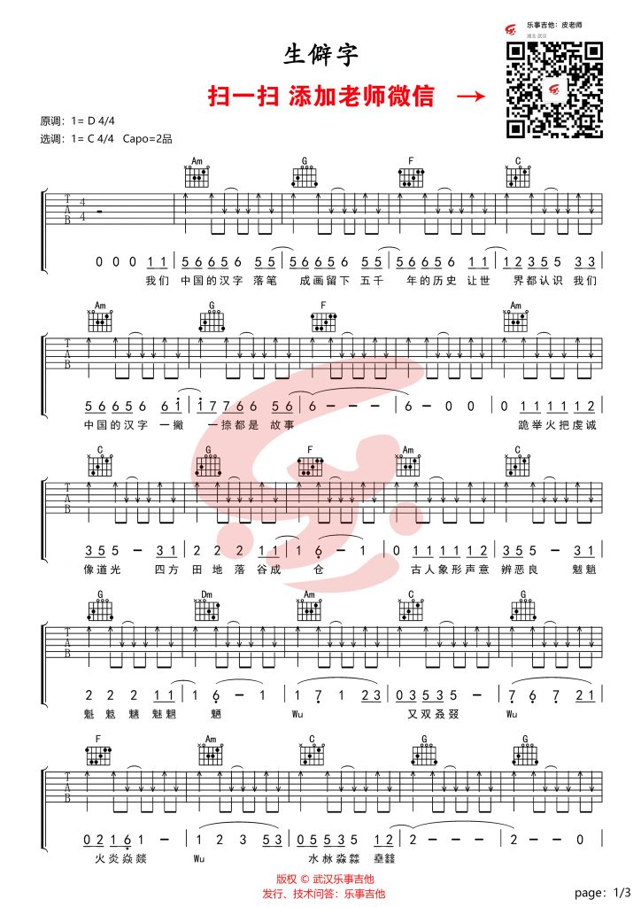 吉他陈柯宇《生僻字》吉他谱 C调简单弹唱版