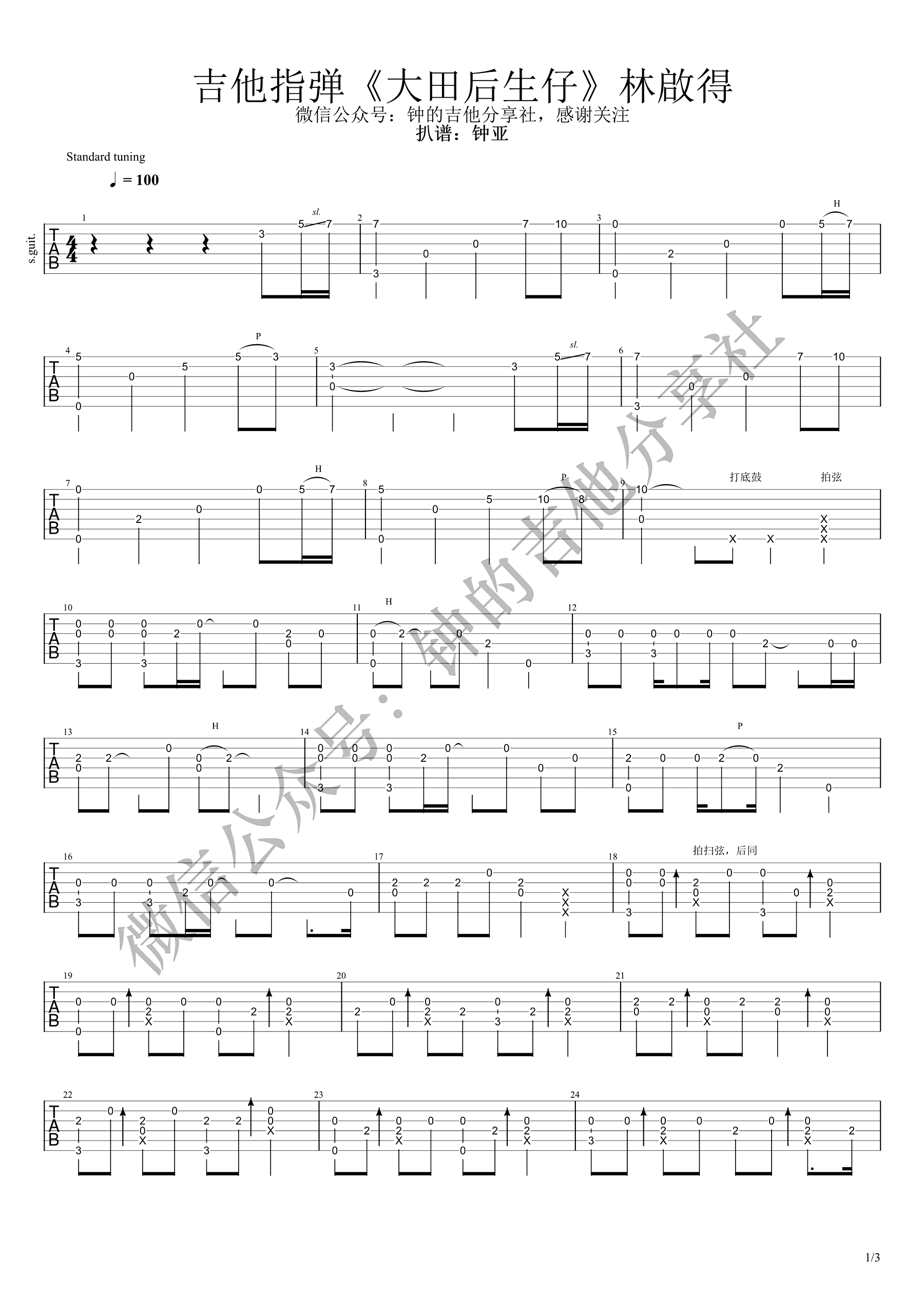 大田后生仔指弹谱,林启得创作的一首写给家乡的闽南语歌曲火遍网络,大田后生仔吉他独奏谱,三张高清图片谱,钟的吉他社出品分享...