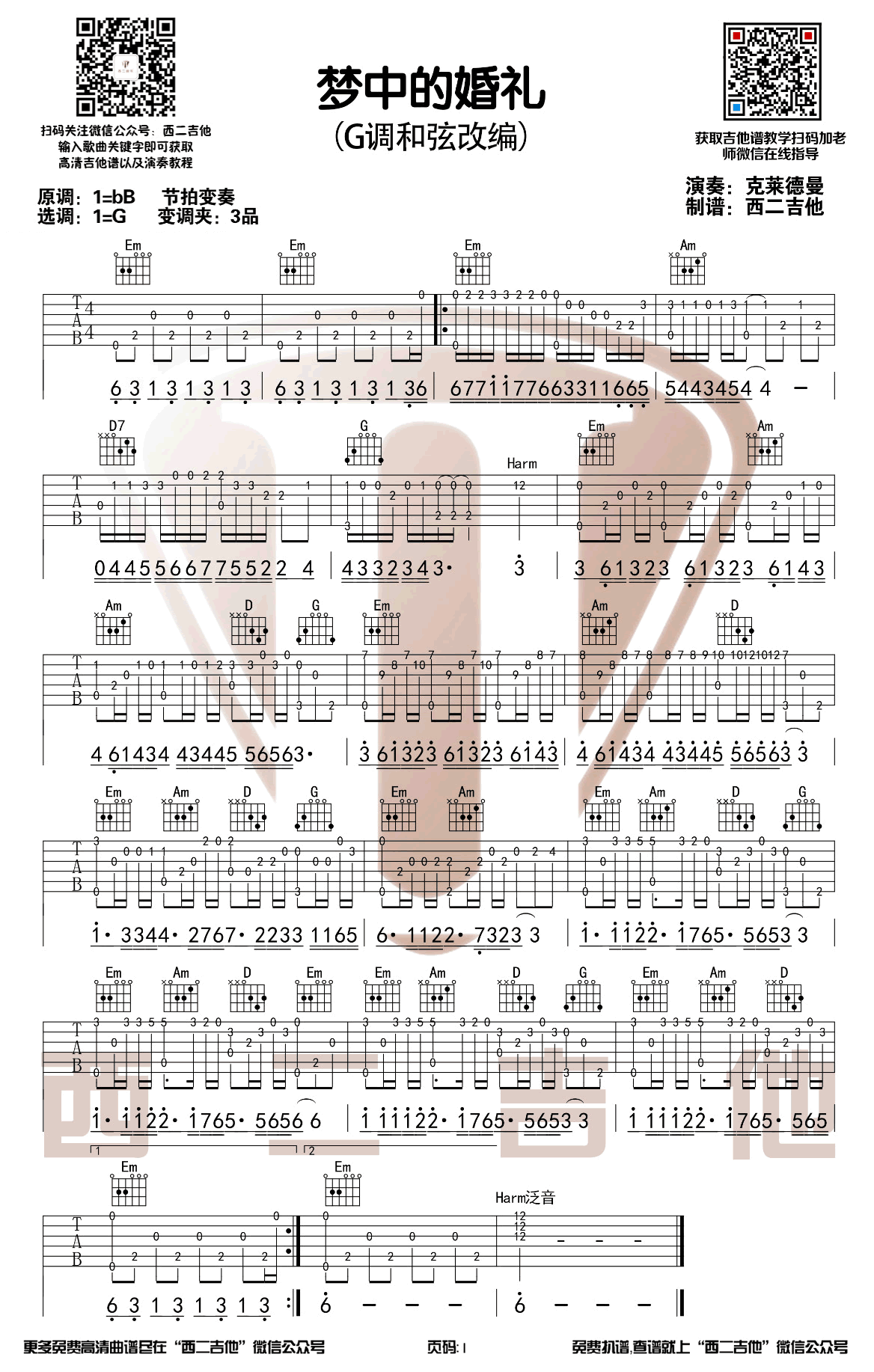 梦中的婚礼指弹谱,理查德·克莱德曼演奏钢琴改编,经典浪漫的曲调加上略带忧伤的梦幻旋律,不知曾打动过多少人的心扉。梦中的婚礼吉他独奏谱,西二吉他编配分享...