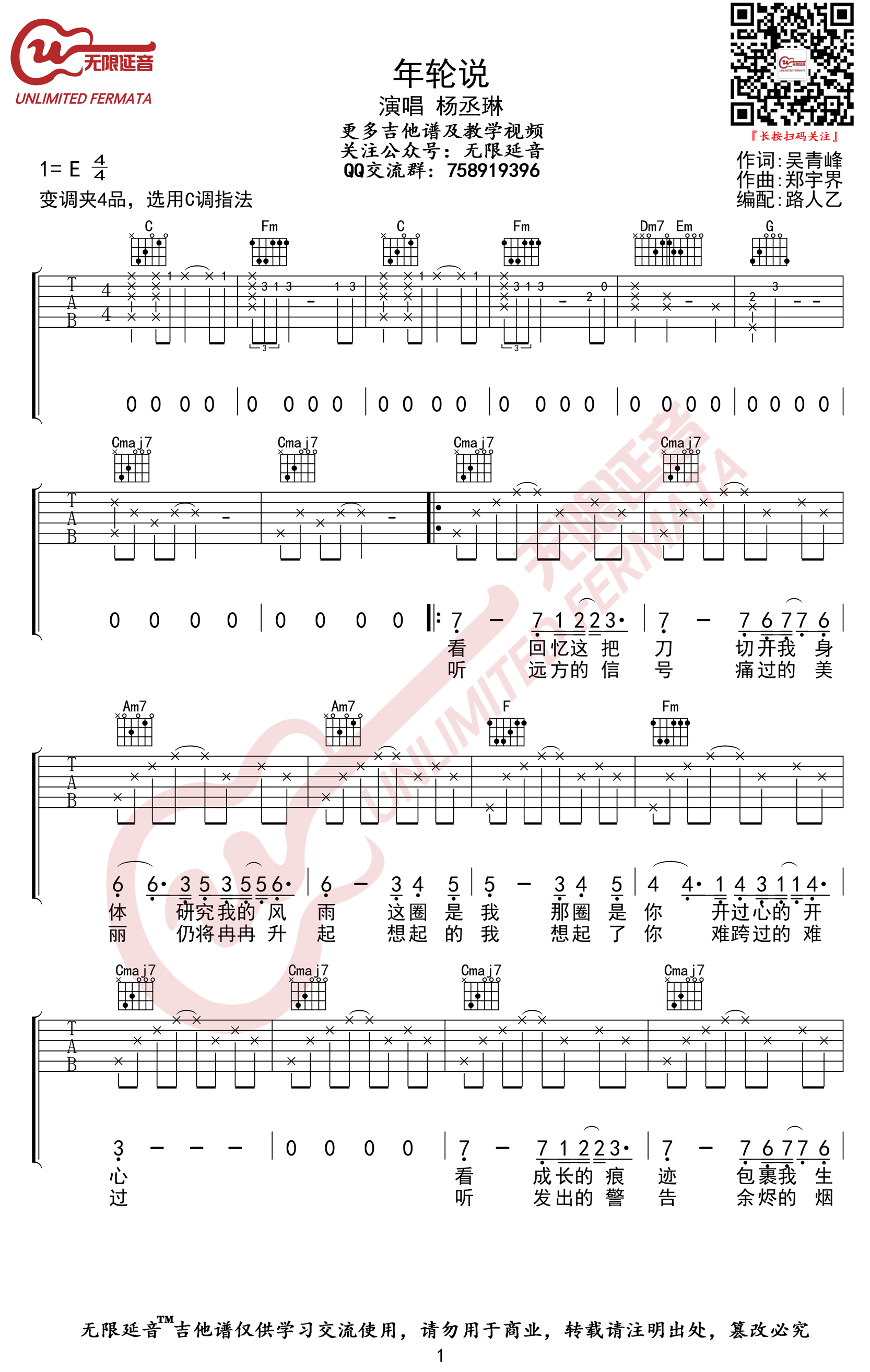 杨丞琳《年轮说》吉他谱,原调E,选用C调指法,变调夹夹四品。年轮说六线谱,三张图片谱高清版,感谢无限延音编配...