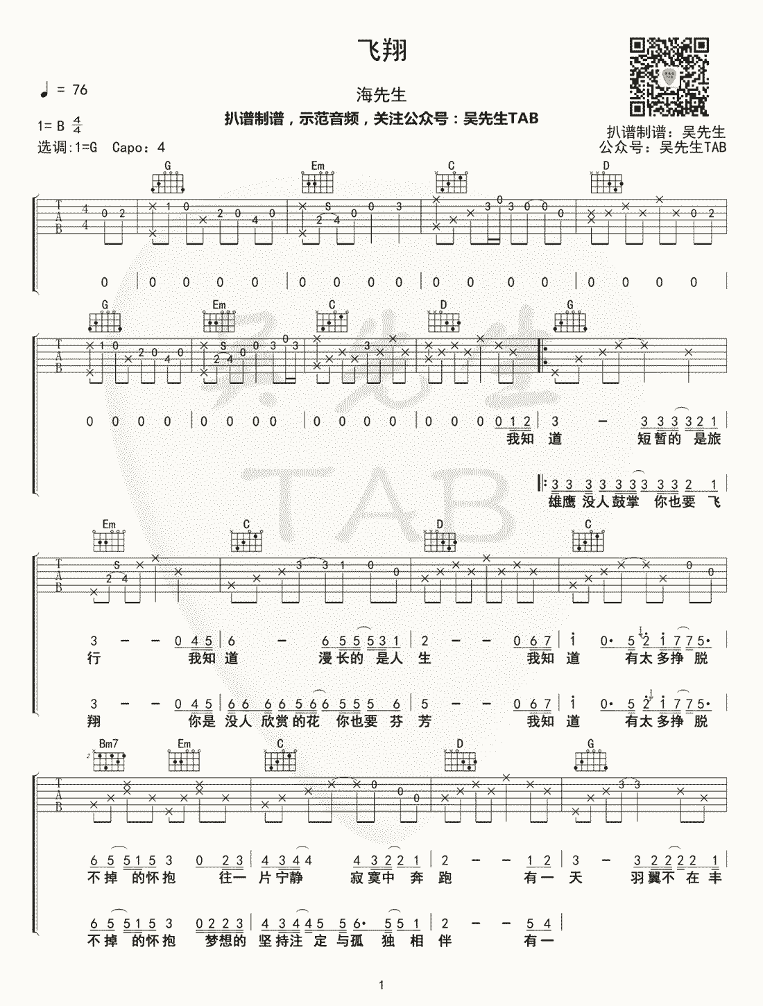 海先生飞翔吉他谱,原调:D,曲谱选G和弦编配(CAPO:4品为歌曲原调)。海先生:飞翔吉他弹唱谱,谱子共四页图片六线谱。...