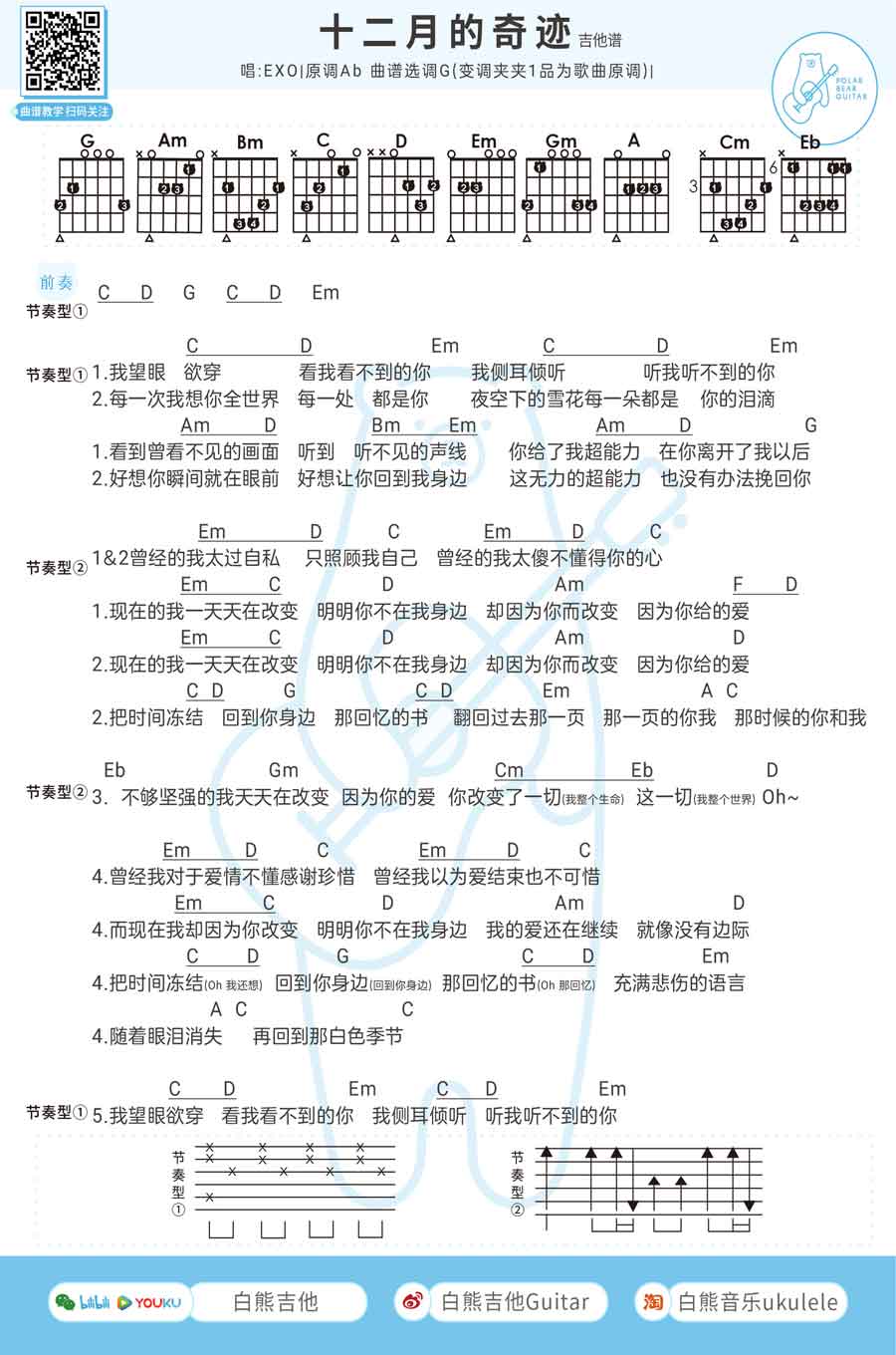EXO:十二月的奇迹吉他谱,原调:降A。曲谱选:G和弦编配(变调夹1品为歌曲原调)。EXO:十二月的奇迹吉他弹唱谱,谱子共1页图片六线谱。...