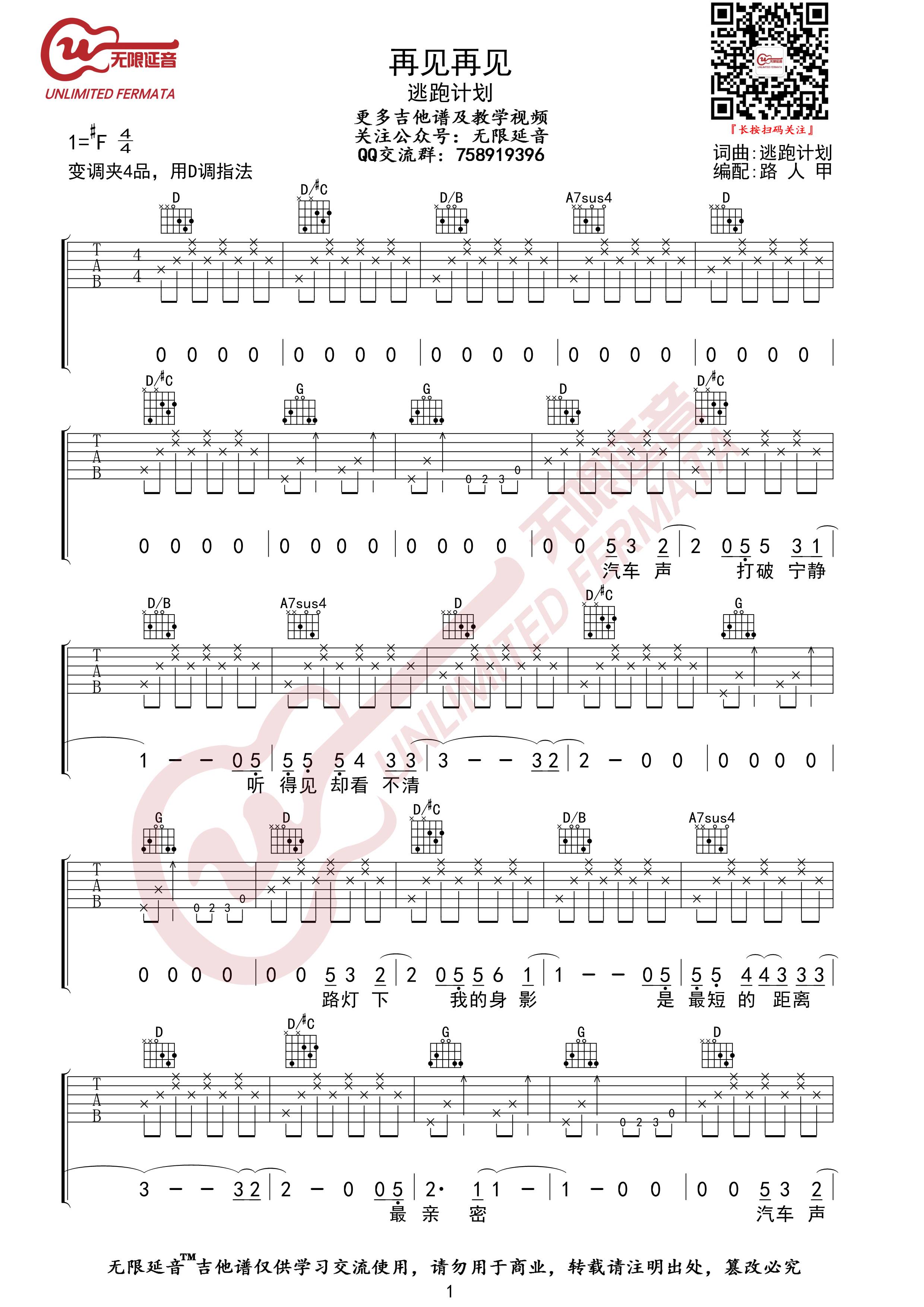 逃跑计划《再见再见》吉他谱分享,来自无限延音编配D调高清六线谱,弹唱变调夹夹第四品,原调#F。...